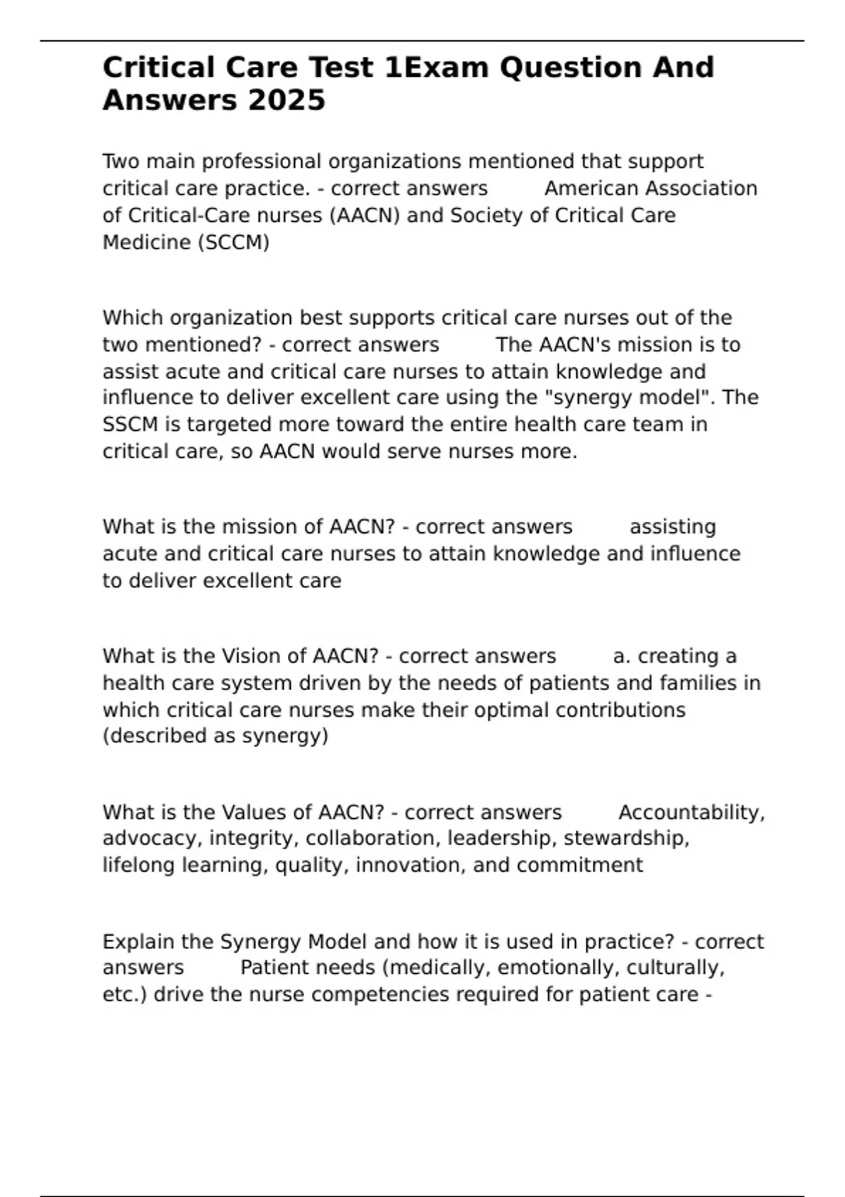 answers ✅✅CCRN (nurses who provide care for critically ill adult,