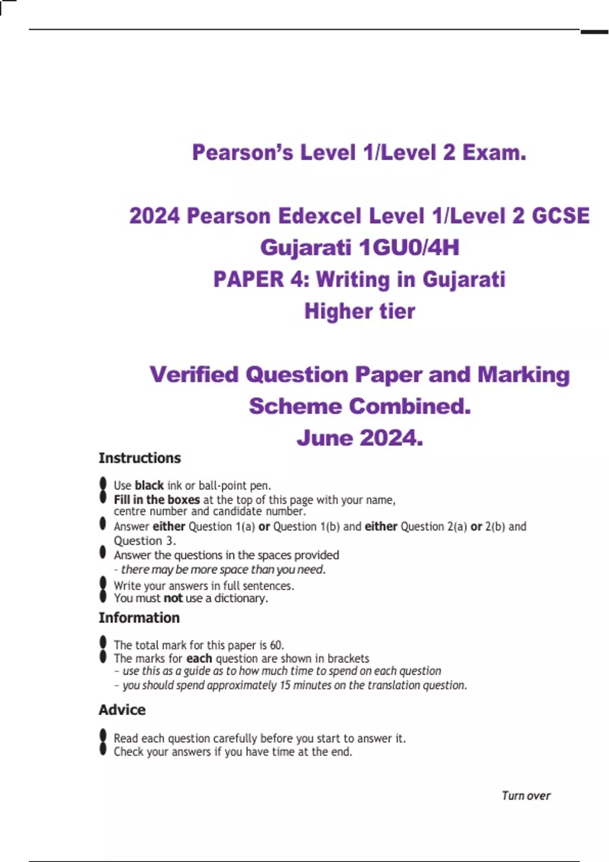 2024 Pearson Edexcel Level 1/Level 2 GCSE Gujarati 1GU0/4H PAPER 4: Writing in Gujarati Higher tier Verified Question Paper and Marking Scheme Combined. June 2024.