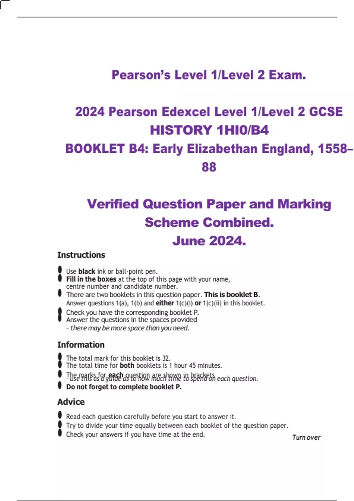 2024 Pearson Edexcel Level 1/Level 2 GCSE HISTORY 1HI0/B4 BOOKLET B4: Early Elizabethan England, 1558 88 Verified Question Paper and Marking Scheme Combined. June 2024.