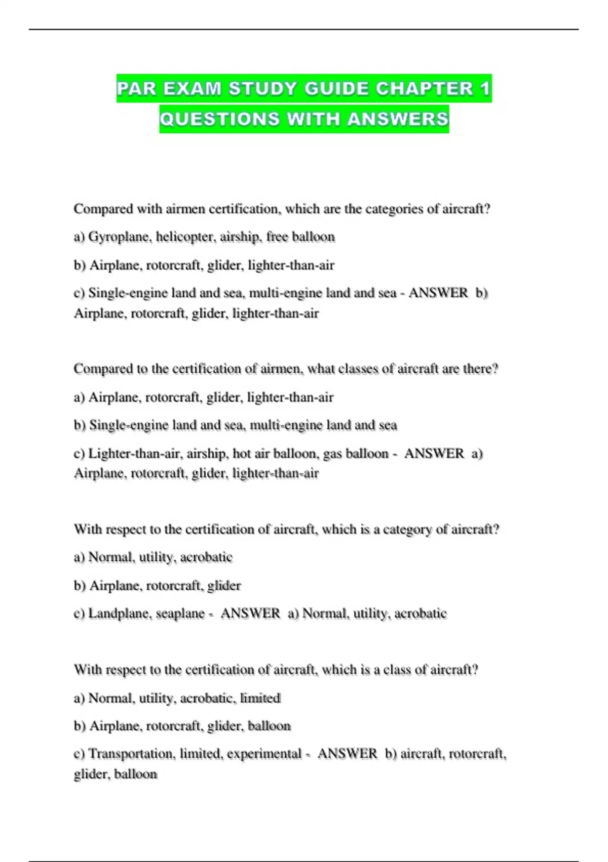 c) Landplane, seaplane - ANSWER a) Normal, utility, acrobatic