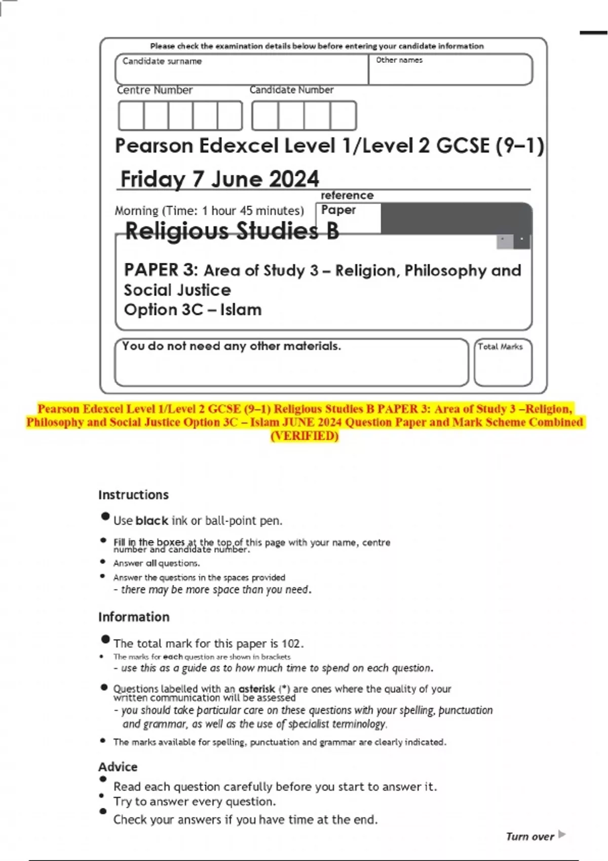 EXAMS BUNDLE::::Pearson Edexcel Level 1/Level 2 GCSE (9–1) Religious Studies B | 2024 Question Papers and MarkScheme Combined (VERIFIED)