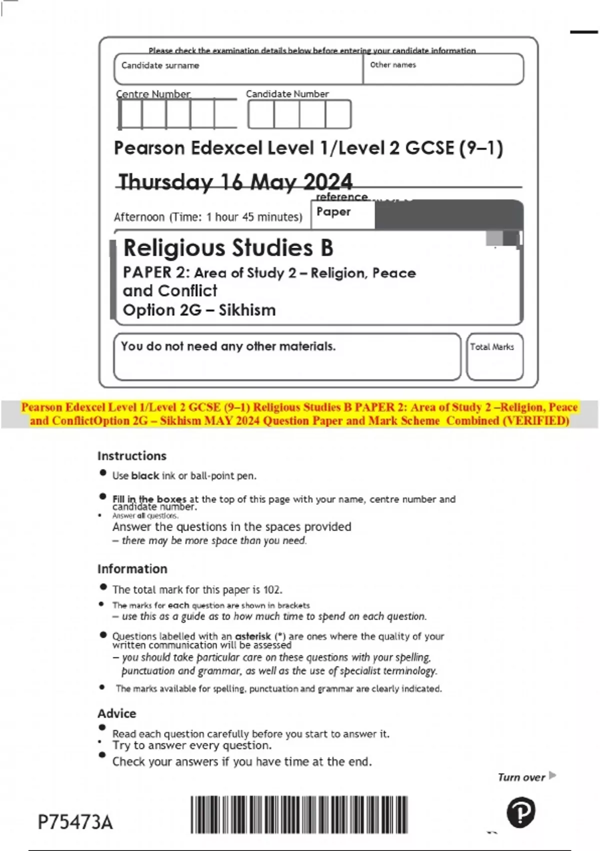 Pearson Edexcel Level 1/Level 2 GCSE (9–1) Religious Studies B PAPER 2: Area of Study 2 –Religion, Peace and ConflictOption 2G – Sikhism MAY 2024 Question Paper and Mark Scheme Combined (VERIFIED)