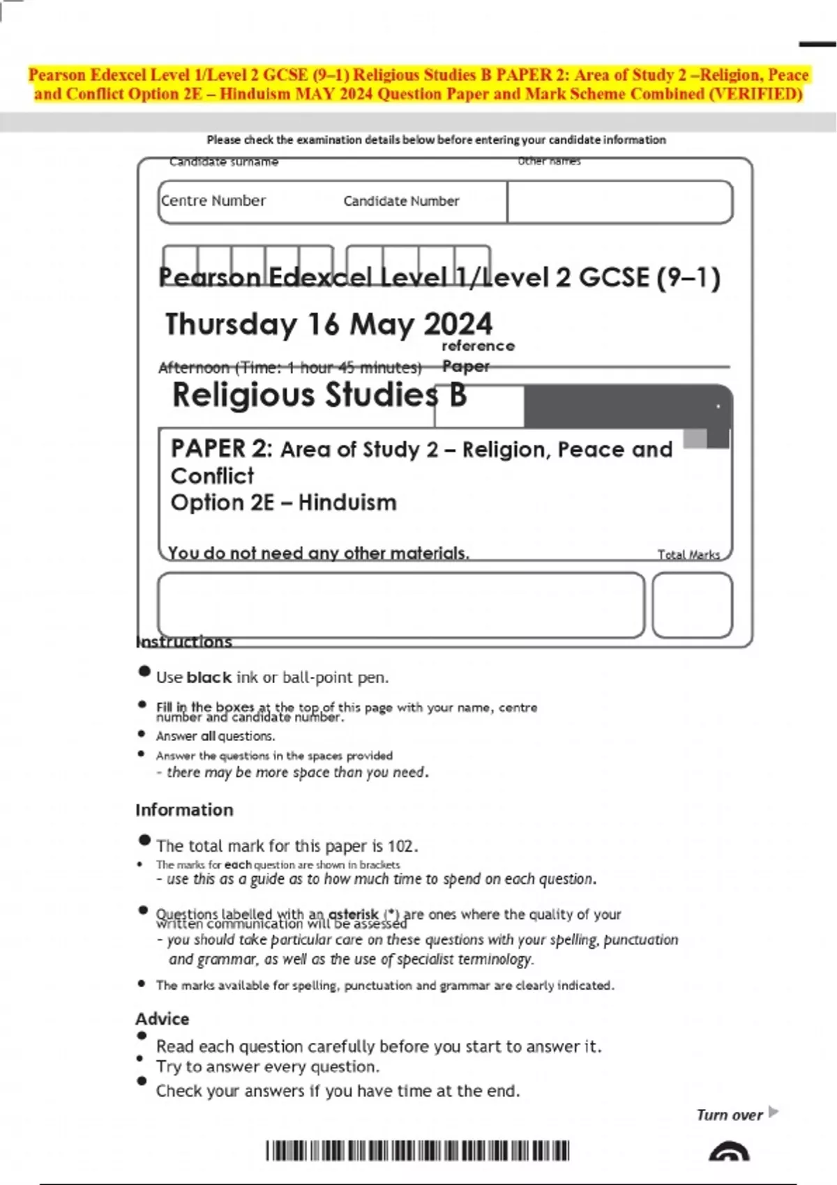 Pearson Edexcel Level 1/Level 2 GCSE (9–1) Religious Studies B PAPER 2: Area of Study 2 –Religion, Peace and Conflict Option 2E – Hinduism MAY 2024 Question Paper and Mark Scheme Combined (VERIFIED