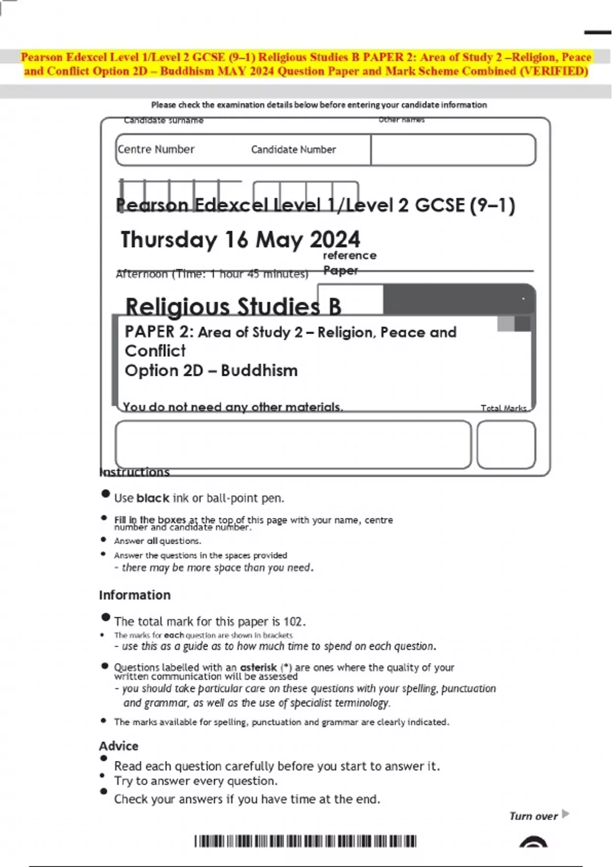 Pearson Edexcel Level 1/Level 2 GCSE (9–1) Religious Studies B PAPER 2: Area of Study 2 –Religion, Peace and Conflict Option 2D – Buddhism MAY 2024 Question Paper and Mark Scheme Combined (VERIFIED)