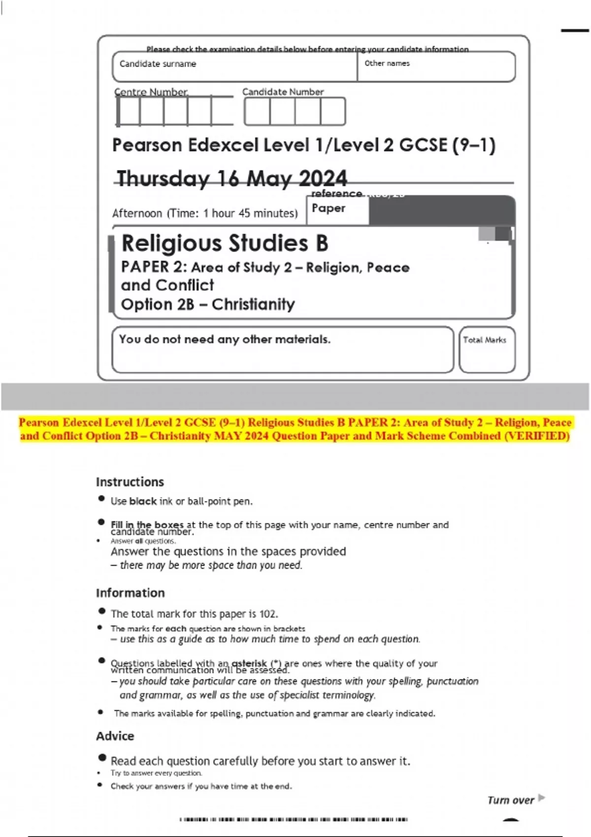 Pearson Edexcel Level 1/Level 2 GCSE (9–1) Religious Studies B PAPER 2: Area of Study 2 – Religion, Peace and Conflict Option 2B – Christianity MAY 2024 Question Paper and Mark Scheme Combined (VERIFIED)