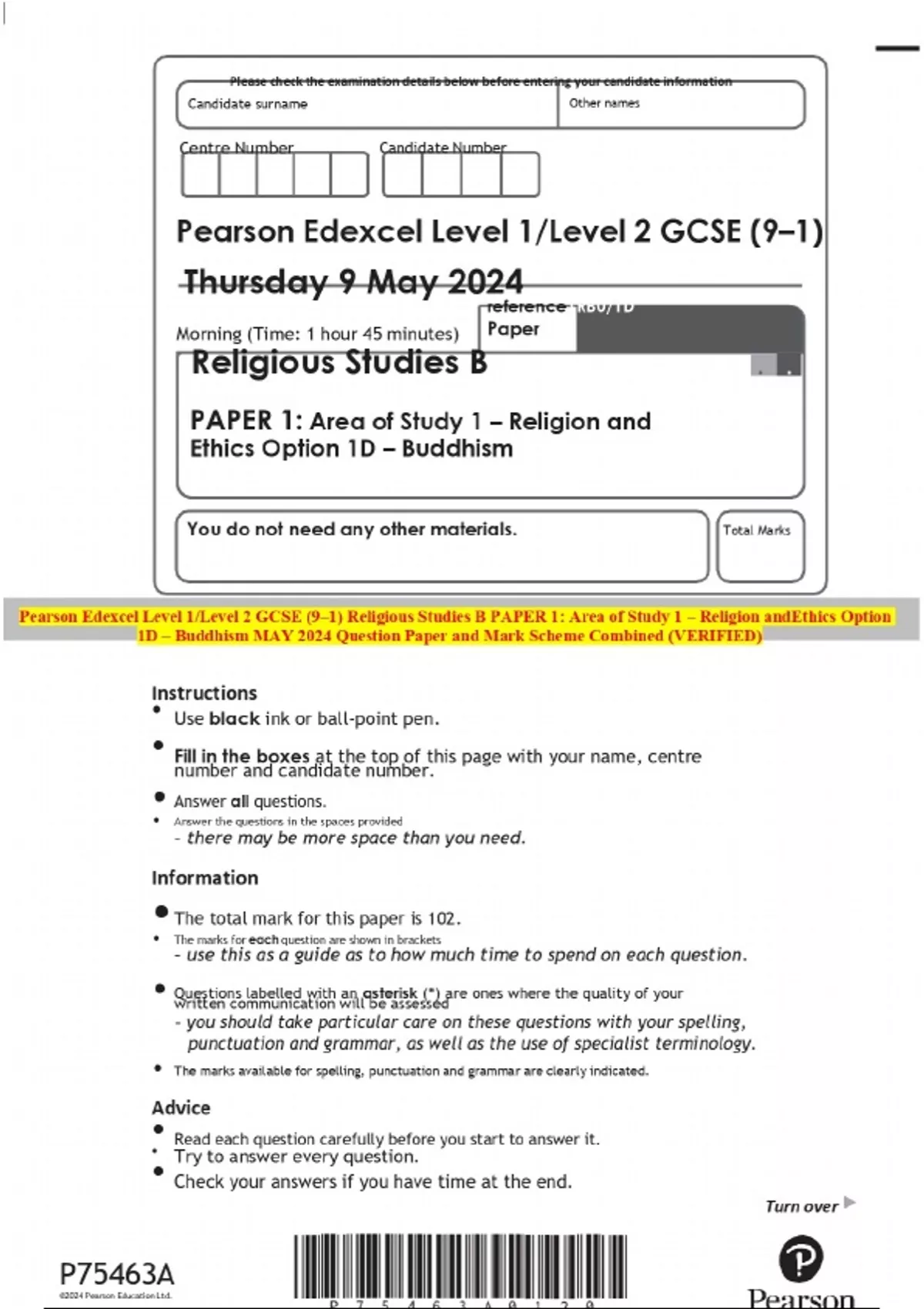 Pearson Edexcel Level 1/Level 2 GCSE (9–1) Religious Studies B PAPER 1: Area of Study 1 – Religion andEthics Option 1D – Buddhism MAY 2024 Question Paper and Mark Scheme Combined (VERIFIED)