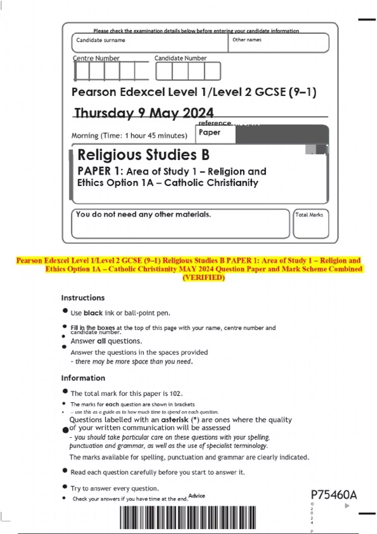 Pearson Edexcel Level 1/Level 2 GCSE (9–1) Religious Studies B PAPER 1: Area of Study 1 – Religion and Ethics Option 1A – Catholic Christianity MAY 2024 Question Paper and Mark Scheme Combined (VERIFIED)