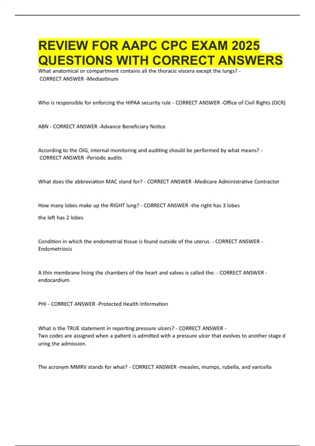 REVIEW FOR AAPC CPC EXAM 2025 QUESTIONS WITH CORRECT ANSWERS
