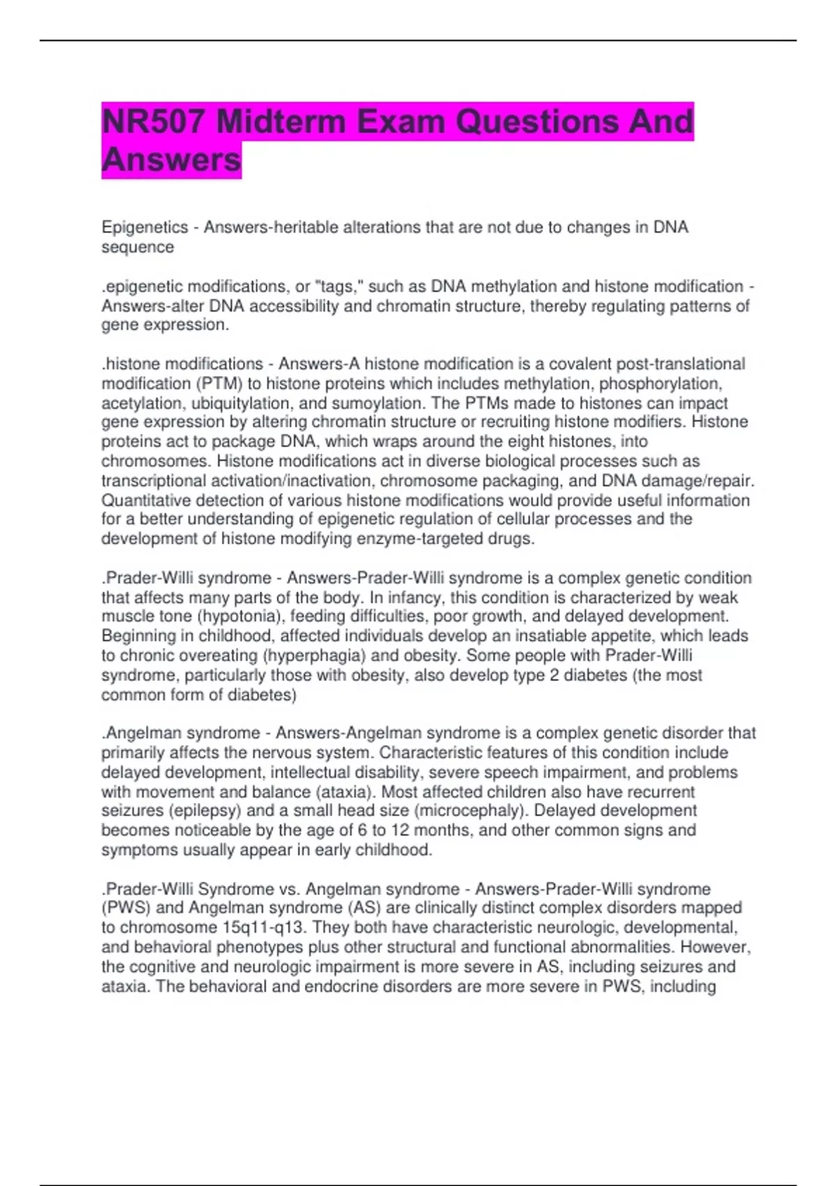 NR507 Midterm Exam Questions And Answers Epigenetics - Answers-heritable alterations that are not due to changes in DNA sequence .epigenetic modifications, or "tags," such as DNA methylation and histone modification - Answers-alter DNA accessibility and chromatin structure, thereby regulating patterns of gene expression. .histone modifications - Answers-A histone modification is a covalent post-translational modification (PTM) to histone proteins which includes methylation, phosphorylation, acetylation, ubiquitylation, and sumoylation. The PTMs made to histones can impact gene expression by altering chromatin structure or recruiting histone modifiers. Histone proteins act to package DNA, which wraps around the eight histones, into chromosomes. Histone modifications act in diverse biological processes such as transcriptional activation/inactivation, chromosome packaging, and DNA damage/repair. Quantitative detection of various histone modifications would provide useful information for a better understanding of epigenetic regulation of cellular processes and the development of histone modifying enzyme-targeted drugs. .Prader-Willi syndrome - Answers-Prader-Willi syndrome is a complex genetic condition that affects many parts of the body. In infancy, this condition is characterized by weak muscle tone (hypotonia), feeding difficulties, poor growth, and delayed development. Beginning in childhood, affected individuals develop an insatiable appetite, which leads to chronic overeating (hyperphagia) and obesity. Some people with Prader-Willi syndrome, particularly those with obesity, also develop type 2 diabetes (the most common form of diabetes) .Angelman syndrome - Answers-Angelman syndrome is a complex genetic disorder that primarily affects the nervous system. Characteristic features of this condition include delayed development, intellectual disability, severe speech impairment, and problems with movement and balance (ataxia). Most affected children also have recurrent seizures (epilepsy) and a small head size (microcephaly). Delayed development becomes noticeable by the age of 6 to 12 months, and other common signs and symptoms usually appear in early childhood. .Prader-Willi Syndrome vs. Angelman syndrome - Answers-Prader-Willi syndrome (PWS) and Angelman syndrome (AS) are clinically distinct complex disorders mapped to chromosome 15q11-q13. They both have characteristic neurologic, developmental, and behavioral phenotypes plus other structural and functional abnormalities. However, the cognitive and neurologic impairment is more severe in AS, including seizures and ataxia. The behavioral and endocrine disorders are more severe in PWS, including obsessive-compulsive symptoms and hypothalamic insufficiency. Both disorders can result from microdeletion, uniparental disomy, or an imprinting center defect in 15q11-q13, although the abnormality is on the paternally derived chromosome 15 for PWS and the maternally derived 15 for AS because of genomic imprinting. Although the same gene may control imprinting for both disorders, the gene(s) causing their phenotypes differ. AS results from underexpression of a single gene, UBE3A, which codes for E6-AP, a protein that functions to transfer small ubiquitin molecules to certain target proteins, to enable their degradation. The genes responsible for PWS are not determined, although several maternally imprinted genes in 15q11-q13 are known. The most likely candidate is SNRPN, which codes for a small nuclear ribonucleoprotein, a ribosome-associated protein that controls gene splicing and thus synthesis of critical proteins in the brain. Animal models exist for both disorders. The genetic relationship between PWS and AS makes them unique and potentially highly instructive disorders that contribute substantially to the population burden of cognitive impairment. .When do circulating erythrocytes play a major role in delivering oxygen to the tissues - Answers-The after two weeks of gestation .When does the production of erythrocytes shift from the vessels to deliver sinusoids? - Answers-At approximately the eighth week of gestation the site shifts from the vessels to deliver sinusoidal. The production of leukocytes and platelets begin in the liver and spleen. Erythropoiesis in the liver and in the spleen and lymph nodes, reaches a peak at approximately four months. .Hematopoiesis begins to occur in the bone marrow in the fifth month increases rapidly until red marrow fills _________________________ - Answers-Entire bone marrow space. .By the time of delivery, the _________________ is the only significant site of hematopoiesis - Answers-Marrow .hematopoetic marrow bills the bony cavities of the entire axial skeleton and many intra-membranous bones in what age group? - Answers-Neonates and young infants .Fatty (yellow) marrow gradually replaces hematopoetc _________________ - Answers-Marrow .Lymphocytes of children have more_____________ and less____________ than do the lymphocytes of adult - Answers-Cytoplasm; compact nuclearchromatin .Infectivity - Answers-Ability of the pathogen to establish an infection. The pathogen capacity or horizontal transmission not in a parent-child relationship. Well will