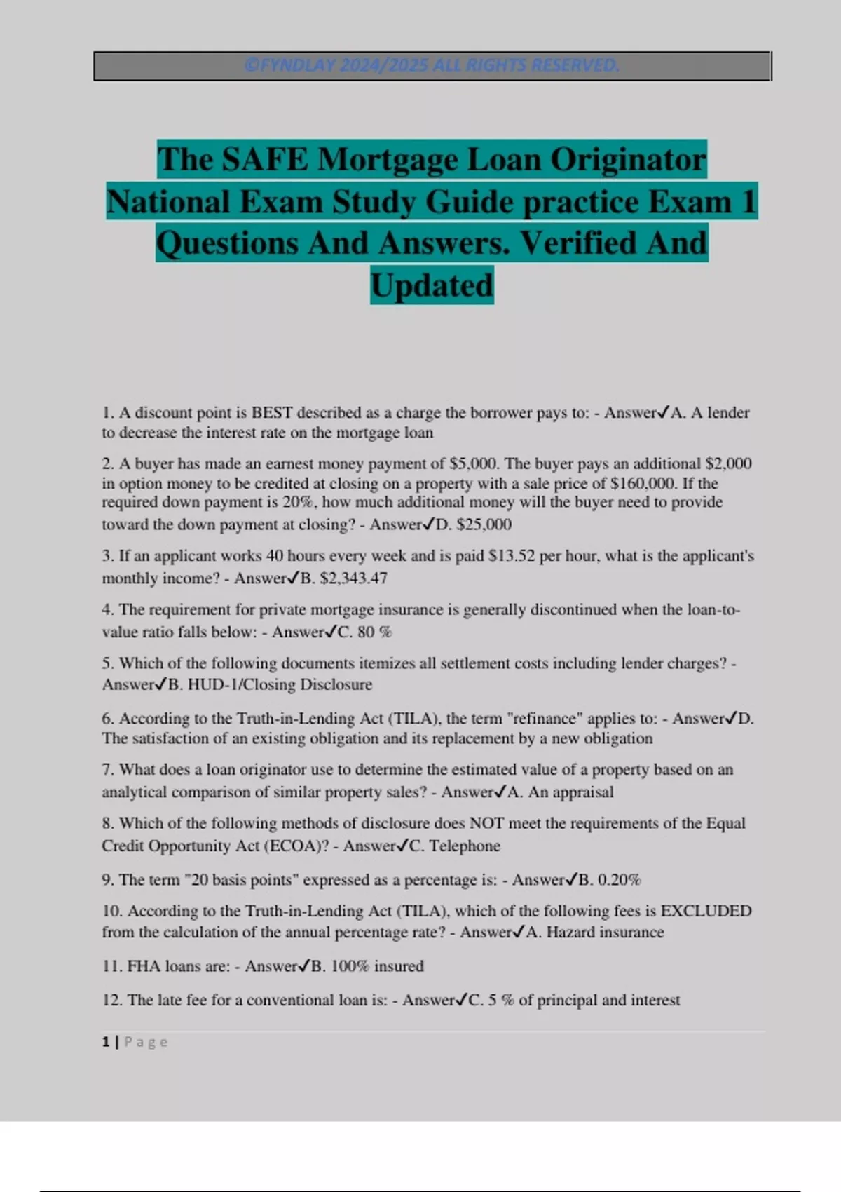 1. A discount point is BEST described as a charge the borrower pays to: - Answer✔A. A lender