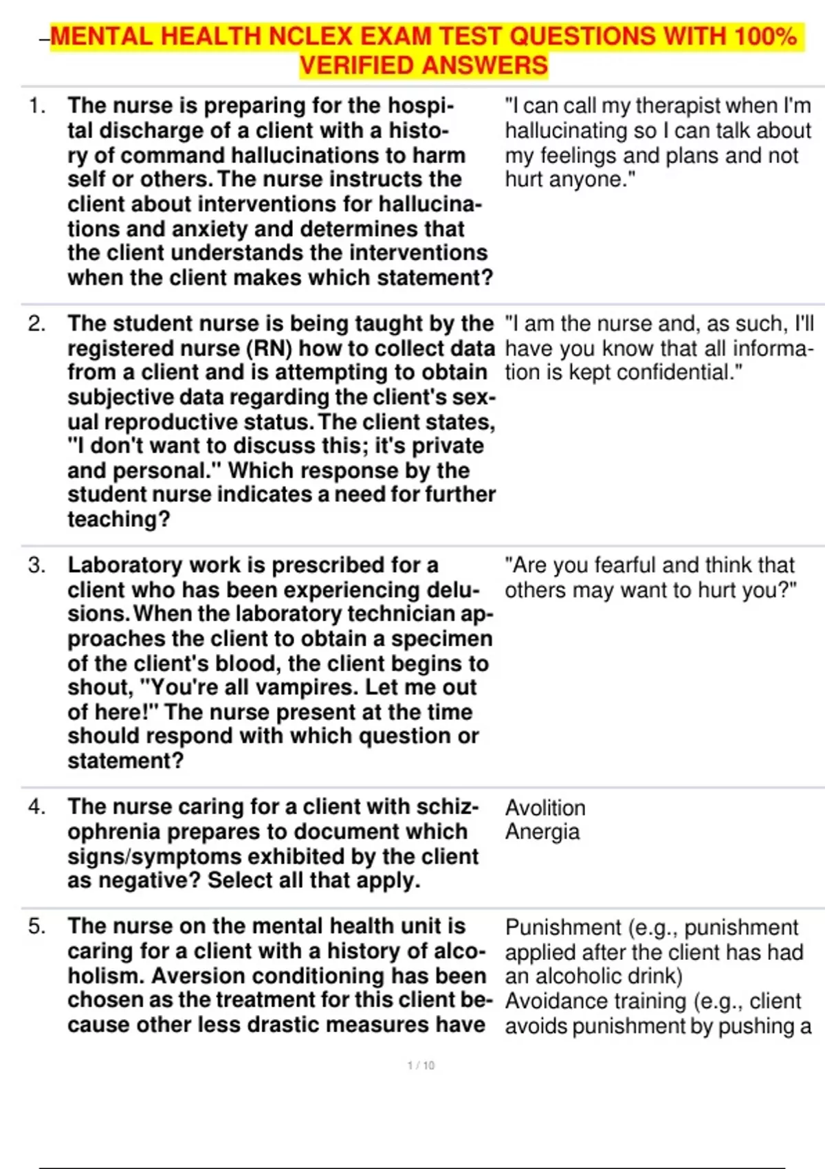 , MENTAL HEALTH NCLEX EXAM TEST QUESTIONS WITH 100%