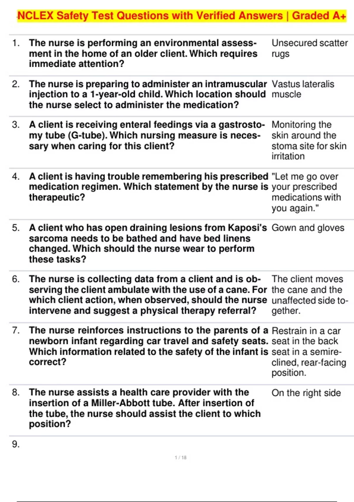 , NCLEX Safety Test Questions with Verified Answers | Graded A+
