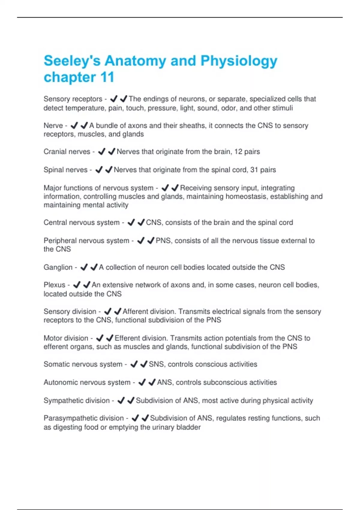 Sensory division - ✔️✔️Afferent division. Transmits electrical signals from the sensory
