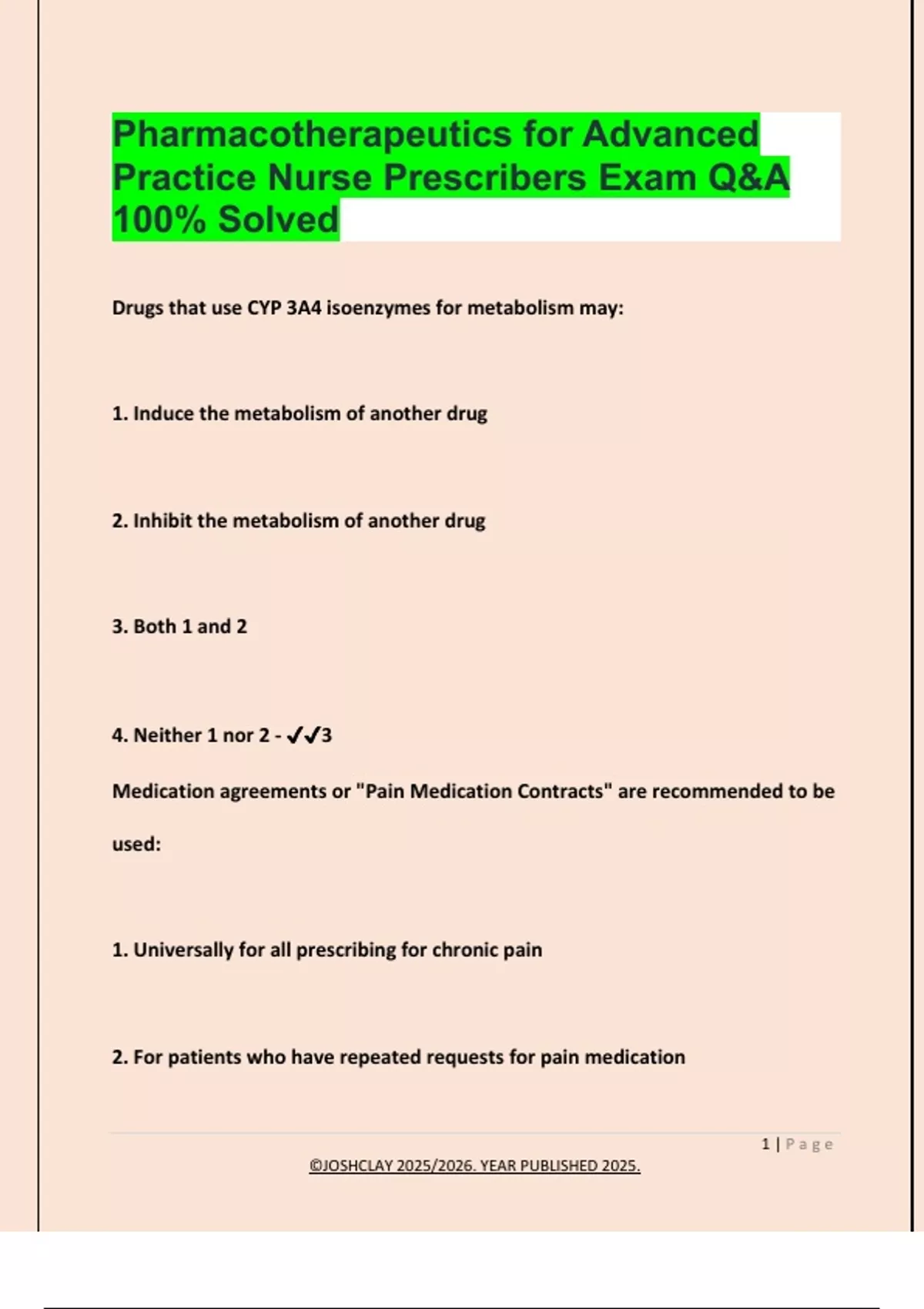 Pharmacotherapeutics for Advanced Practice Nurse Prescribers Exam Q&A 100% Solved Drugs that use CYP 3A4 isoenzymes for metabolism may: 1. Induce the metabolism of another drug 2. Inhibit the metabolism of another drug 3. Both 1 and 2 4. Neither 1 nor 2 - 3 Medication agreements or "Pain Medication Contracts" are recommended to be used: 1. Universally for all prescribing for chronic pain 2. For patients who have repeated requests for pain medication