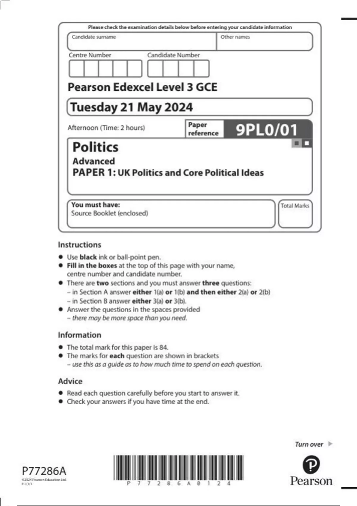 Pearson Edexcel Level 3 GCE Politics Advanced PAPER 1: UK 9pl0-01 Politics and Core Political Ideas question paper june 2024