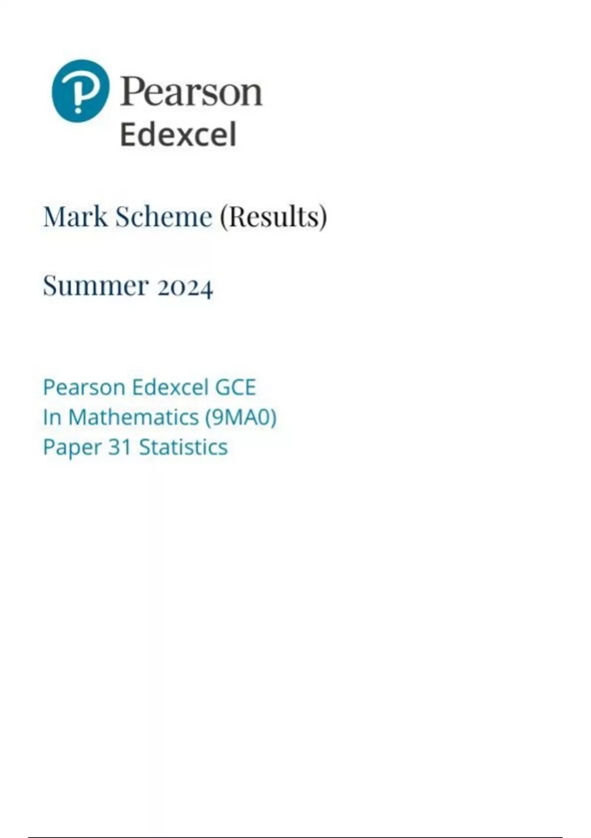 Pearson Edexcel GCE In Mathematics 9ma0-31 (9MA0) Paper 31 Statistics mark scheme june 2024
