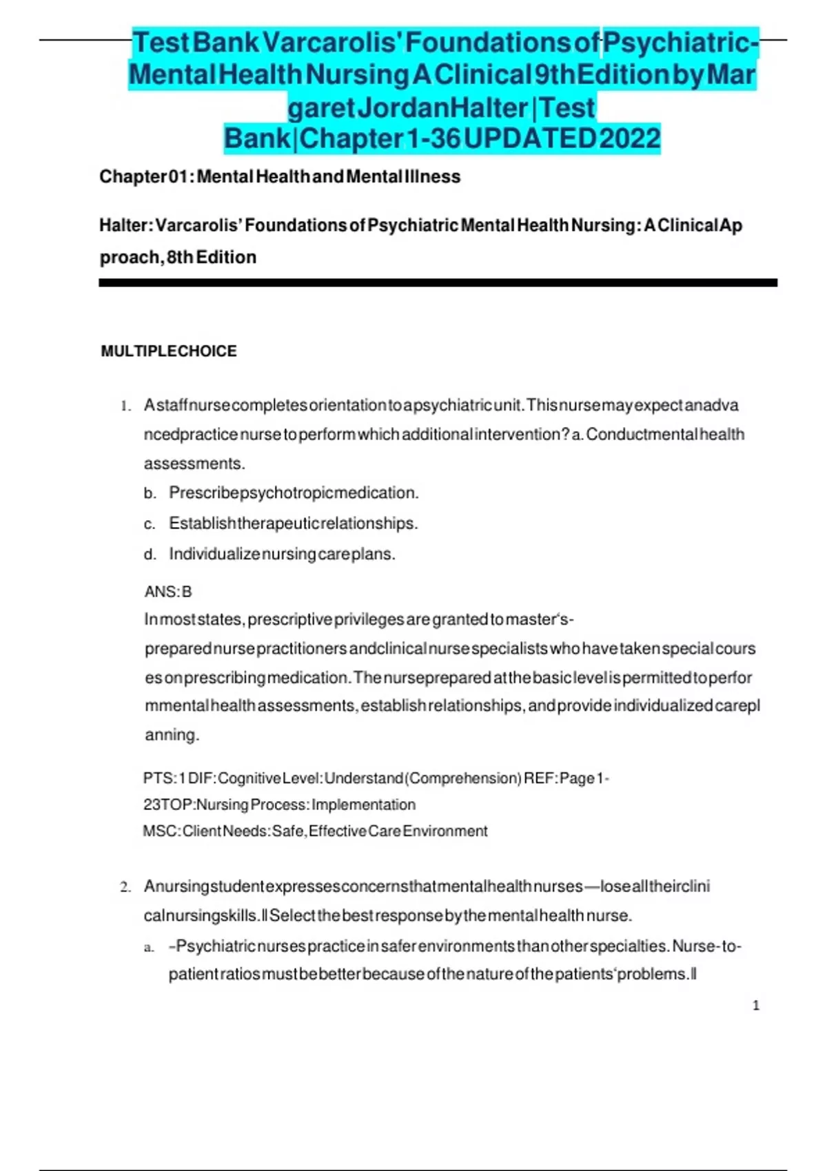 , Test Bank Varcarolis' Foundations of Psychiatric-