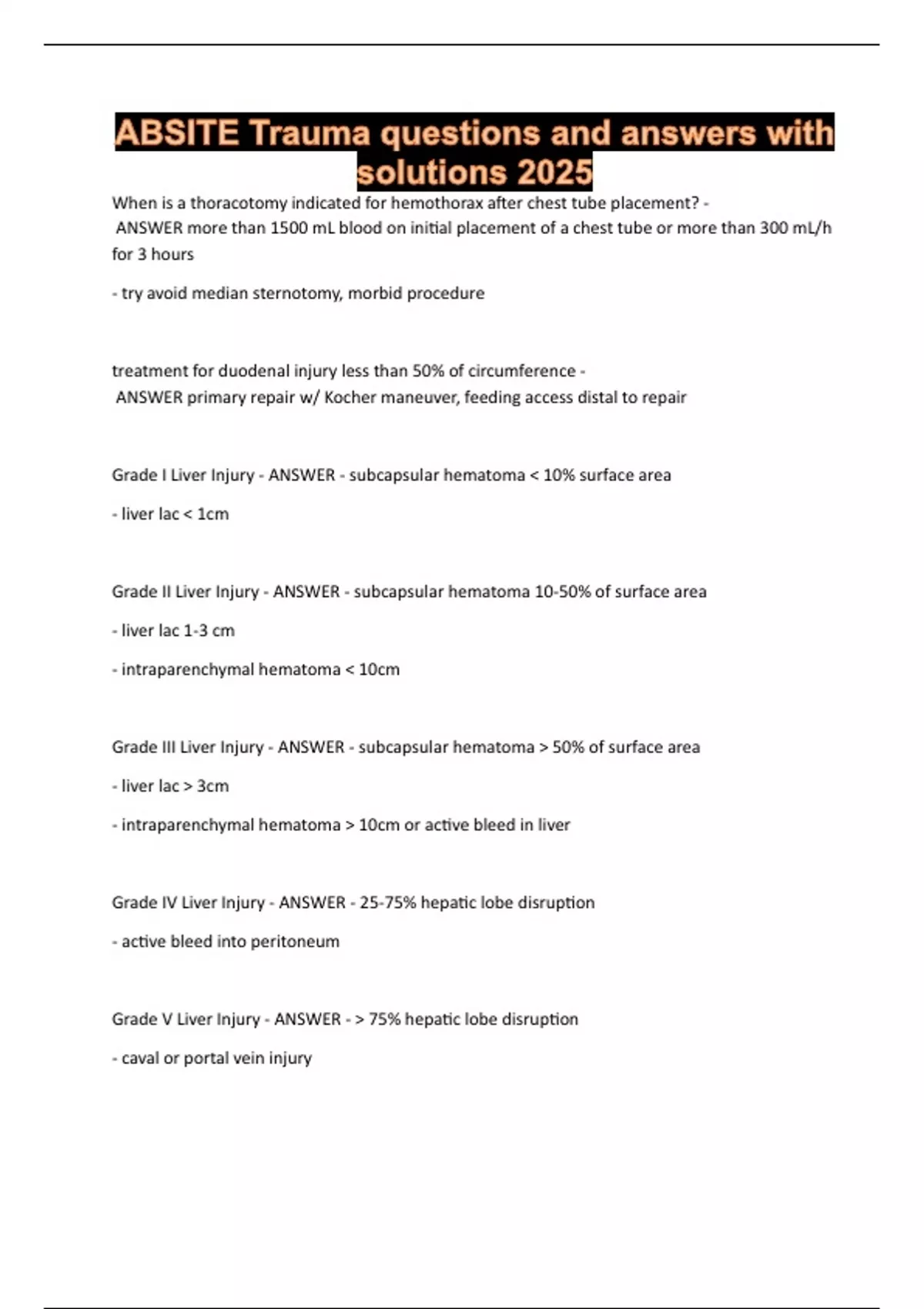 Grade I Liver Injury - ANSWER - subcapsular hematoma < 10% surface area