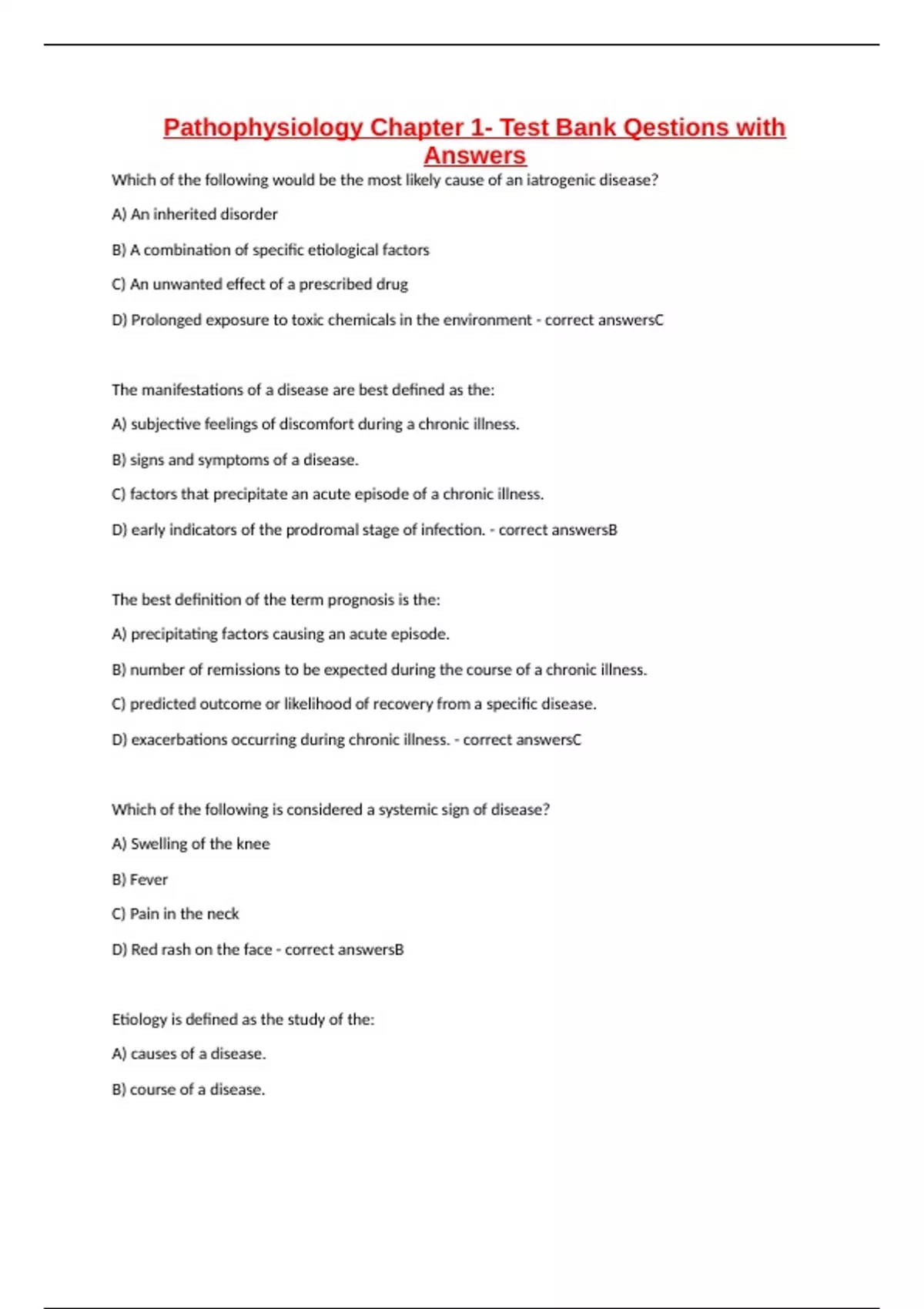 Pathophysiology Chapter 1- Test Bank Qestions with Answers Which of the following would be the most likely cause of an iatrogenic disease? A) An inherited disorder B) A combination of specific etiological factors C) An unwanted effect of a prescribed drug D) Prolonged exposure to toxic chemicals in the environment - correct answersC The manifestations of a disease are best defined as the: A) subjective feelings of discomfort during a chronic illness. B) signs and symptoms of a disease. C) factors that precipitate an acute episode of a chronic illness. D) early indicators of the prodromal stage of infection. - correct answersB The best definition of the term prognosis is the: A) precipitating factors causing an acute episode. B) number of remissions to be expected during the course of a chronic illness. C) predicted outcome or likelihood of recovery from a specific disease. D) exacerbations occurring during chronic illness. - correct answersC Which of the following is considered a systemic sign of disease? A) Swelling of the knee B) Fever C) Pain in the neck D) Red rash on the face - correct answersB Etiology is defined as the study of the: A) causes of a disease. B) course of a disease. C) expected complications of a disease. D) manifestations of a disease. - correct answersA A type of cellular adaptation in which there is a decrease in cell size is referred to as: A) hypertrophy B) metaplasia C) anaplasia D) atrophy - correct answersD