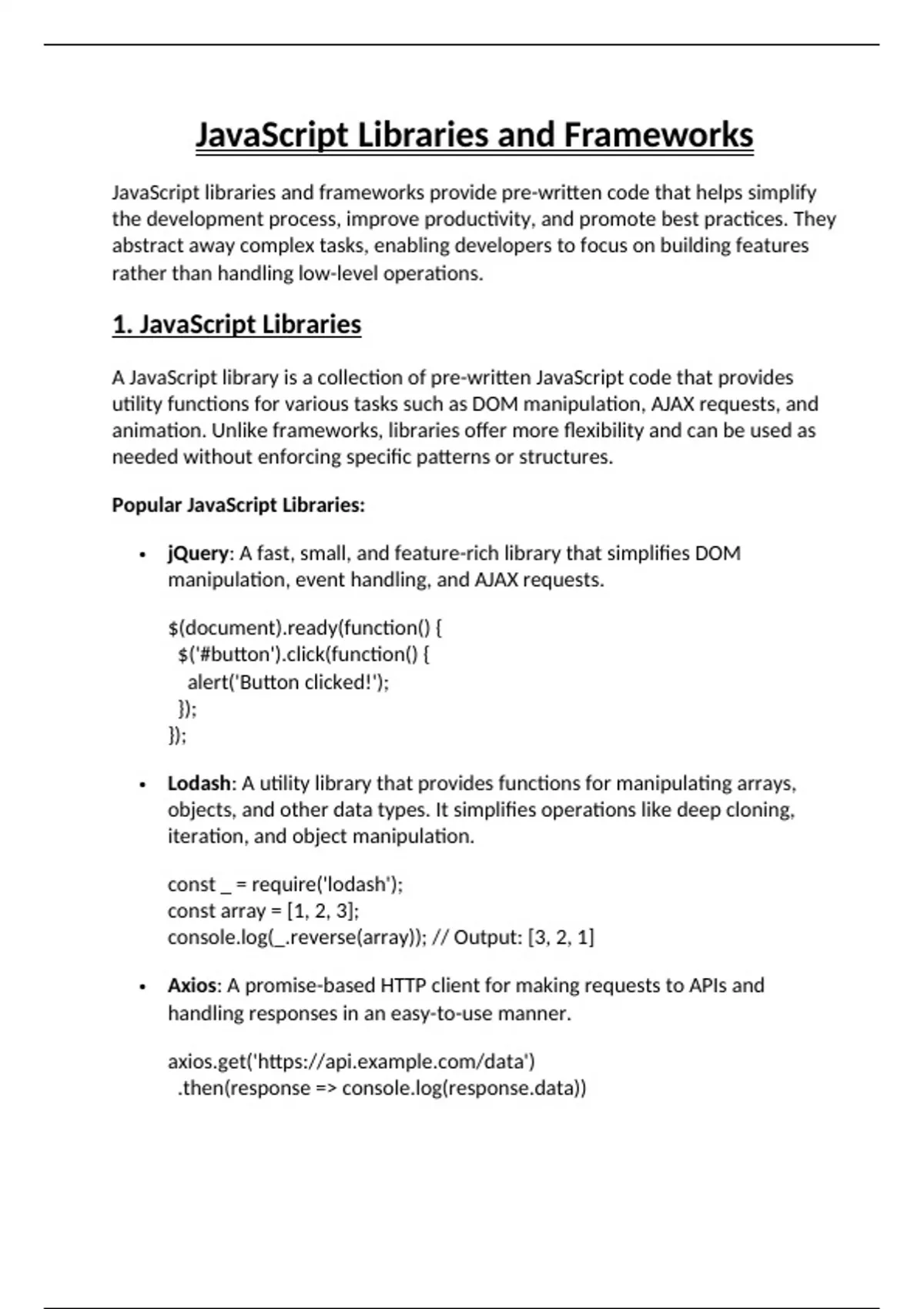 This document introduces JavaScript libraries and frameworks, including popular tools like React, Angular, Vue, and jQuery. Learn about the differences between libraries and frameworks, and how to use them for building modern, dynamic web applications.