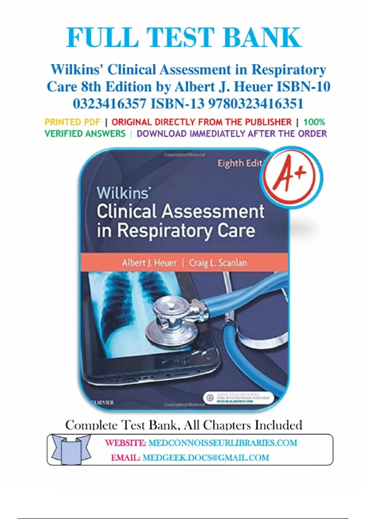 Contents: 1. Preparing for the Patient Encounter 2. The Medical History and the Interview 3. Cardiopulmonary Symptoms 4. Vital Signs 5. Fundamentals of Physical Examination 6. Neurologic Assessment 7. Clinical Laboratory Studies 8. Interpretation of Blood Gases 9. Pulmonary Function Testing 10. Chest Imaging 11. Electrocardiography 12. Neonatal and Pediatric Assessment 13. Older Patient Assessment 14. Monitoring in Critical Care 15. Vascular Pressure Monitoring 16. Cardiac Output Measurement 17. Bronchoscopy 18. Nutritional Assessment 19. Sleep and Breathing Assessment 20. Home Care Patient Assessment 21. Documentation TEST BANK Contents: Chapter 1. Preparing for the Patient Encounter Chapter 2. The Medical History and the Interview Chapter 3. Cardiopulmonary Symptoms Chapter 4. Vital Signs Chapter 5. Fundamentals of Physical Examination Chapter 6. Neurologic Assessment Chapter 7. Clinical Laboratory Studies Chapter 8. Interpretation of Blood Gases Chapter 9. Pulmonary Function Testing Chapter 10. Chest Imaging Chapter 11. Electrocardiography Chapter 12. Neonatal and Pediatric Assessment Chapter 13. Older Patient Assessment Chapter 14. Monitoring in Critical Care Chapter 15. Vascular Pressure Monitoring Chapter 16. Cardiac Output Measurement Chapter 17. Bronchoscopy Chapter 18. Nutritional Assessment Chapter 19. Sleep and Breathing Assessment Chapter 20. Home Care Patient Assessment Chapter 21. Documentation Wilkins' Clinical Assessment in Respiratory Care, 7th Edition Chapter 1: Preparing for the Patient Encounter Test Bank MULTIPLE CHOICE 1. Which of the following activities is not part of the role of respiratory therapists (RTs) in patient assessment? a. Assist the physician with diagnostic reasoning skills. b. Help the physician select appropriate pulmonary function tests. c. Interpret arterial blood gas values and suggest mechanical ventilation changes. d. Document the patient diagnosis in the patient’s chart. ANS: D RTs are not qualified to make an official diagnosis. This is the role of the attending physician. REF: Table 1-1, pg. 4 OBJ: 9 2. In which of the following stages of patient–clinician interaction is the review of physician orders carried out? a. Treatment stage b. Introductory stage c. Preinteraction stage d. Initial assessment stage ANS: C Physician orders should be reviewed in the patient’s chart before the physician sees the patient. REF: Table 1-1, pg. 4 OBJ: 9 3. In which stage of patient–clinician interaction is the patient identification bracelet checked? a. Introductory stage b. Preinteraction stage c. Initial assessment stage d. Treatment stage ANS: A The patient ID bracelet must be checked before moving forward with assessment and treatment. REF: Table 1-1, pg. 4 OBJ: 9 4. What should be done just before the patient’s ID bracelet is checked? a. Check the patient’s SpO2. b. Ask the patient for permission. c. Check the chart for vital signs. d. Listen to breath sounds. ANS: B It is considered polite to ask the patient for permission before touching and reading his or her ID bracelet. REF: pg. 3 OBJ: 3 | 5 5. What is the goal of the introductory phase? a. Assess the patient’s apparent age. b. Identify the patient’s family history. c. Determine the patient’s diagnosis. d. Establish a rapport with the patient. ANS: D The introductory phase is all about getting to know the patient and establishing a rapport with him or her. REF: Table 1-1, pg. 4 OBJ: 3 6. Which of the following behaviors is not consistent with resistive behavior of a patient? a. Crossed arms b. Minimal eye contact c. Brief answers to questions d. Asking the purpose of the treatment ANS: D If a patient asks about the purpose of the treatment you are about to give, this generally indicates that he or she is not upset. REF: Table 1-1, pg. 4 OBJ: 3 7. What is the main purpose of the initial assessment stage? a. To identify any allergies to medications b. To document the patient’s smoking history c. To personally get to know the patient better d. To verify that the prescribed treatment is still needed and appropriate ANS: D When you first see the patient, you are encouraged to perform a brief assessment to make sure the treatment order by the physician is still appropriate. The patient’s status may have changed abruptly recently. REF: Table 1-1, pg. 4 OBJ: 3 8. What is the appropriate distance for the social space from the patient? a. 3 to 5 feet b. 4 to 12 feet c. 6 to 18 feet d. 8 to 20 feet ANS: B The social space is 4 to 12 feet. REF: pg. 5 OBJ: 5 9. What is the appropriate distance for the personal space? a. 0 to 18 inches b. 18 inches to 4 feet c. 4 to 12 feet d. 6 to 15 feet ANS: B The personal space is about 2 to 4 feet from the patient. REF: pg. 5 OBJ: 5 10. Which of the following activities is best performed in the personal space? a. The interview b. The introduction c. The physical examination d. Listening for breath sounds ANS: A The interview is best performed with you sitting about 2 to 4 feet from the patient. If you sit farther away, the patient will have to answer your questions in a louder voice, and because some of the information may be private, this would diminish communication. REF: Table 1-1, pg. 4 OBJ: 5 11. What type of behavior is least appropriate in the patient’s intimate space? a. Eye contact b. Pulse check c. Auscultation d. Simple commands ANS: A Eye contact is inappropriate in the intimate space and will make the patient very uncomfortable. REF: pg. 3 OBJ: 5 12. You are riding in an elevator at the hospital where you are employed as an RT. The elevator is full, but standing next to you is Joe, the RT who is scheduled to relieve you. He turns to you and asks, “How is Mr. Copper doing?” Earlier in the day, Mr. Copper had a cardiac arrest, and he is now being mechanically ventilated. How should you respond to Joe? a. “He took a turn for the worse.” b. “He is fine.” c. “Let’s talk later in the report room.” d. “He is on a ventilator 
