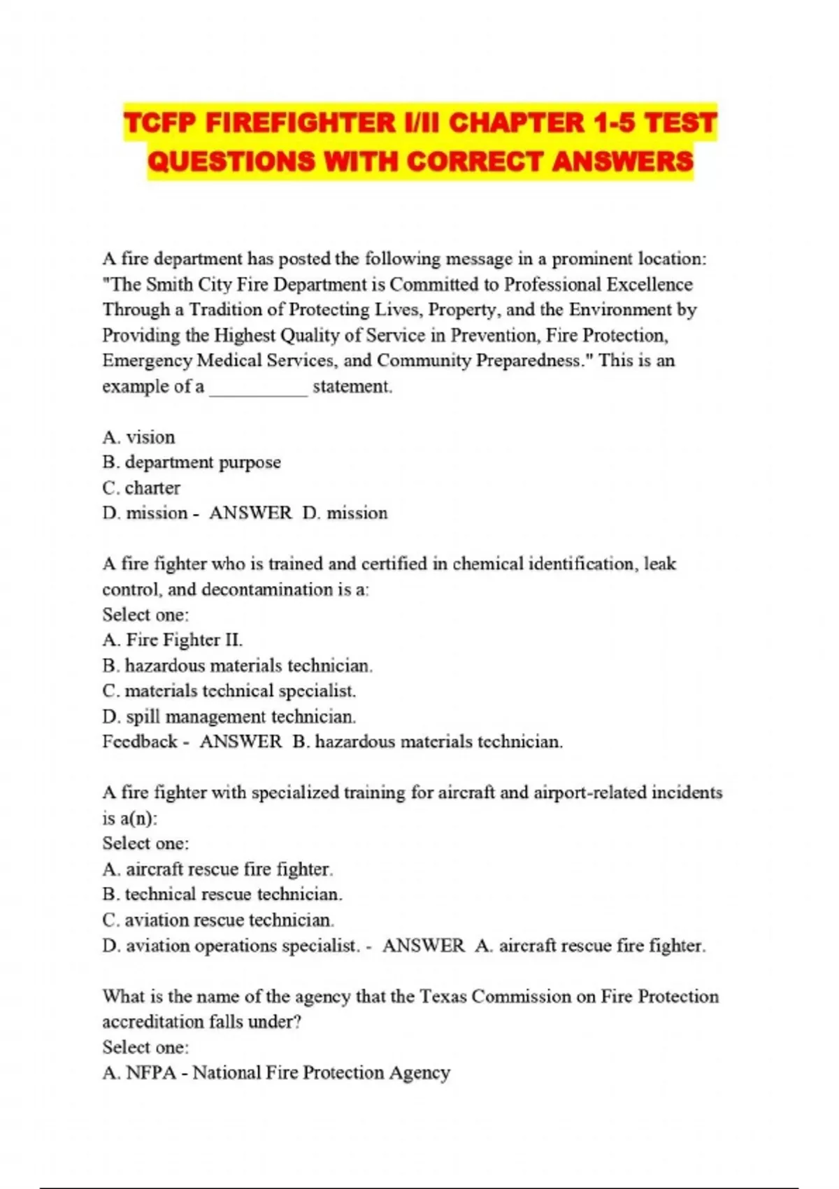 TCFP FIREFIGHTER I/II CHAPTER 1-5 TEST QUESTIONS WITH CORRECT ANSWERS....