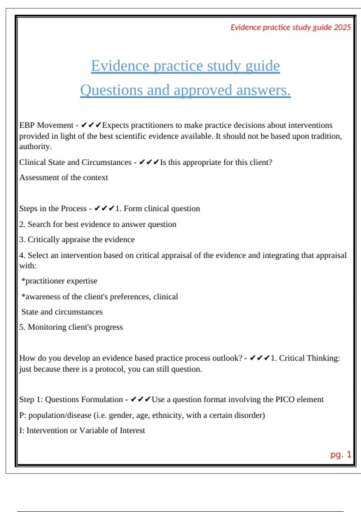 EBP Movement - Expects practitioners to make practice decisions about interventions provided in light of the best scientific evidence available. It should not be based upon tradition, authority. Clinical State and Circumstances - Is this appropriate for this client? Assessment of the context Steps in the Process - 1. Form clinical question 2. Search for best evidence to answer question 3. Critically appraise the evidence 4. Select an intervention based on critical appraisal of the evidence and integrating that appraisal with: *practitioner expertise *awareness of the client's preferences, clinical State and circumstances 5. Monitoring client's progress How do you develop an evidence based practice process outlook? - 1. Critical Thinking: just because there is a protocol, you can still question. Step 1: Questions Formulation - Use a question format involving the PICO element P: population/disease (i.e. gender, age, ethnicity, with a certain disorder) I: Intervention or Variable of Interest C: Comparison O: Outcome What is EBP? - *A Process which includes: *the most rigorous scientific evidence available. *practitioner expertise-common sense and gut feeling *client attributes, values, preferences and circumstances *assessing if intervention is achieving desired outcomes *evaluating alternative interventions