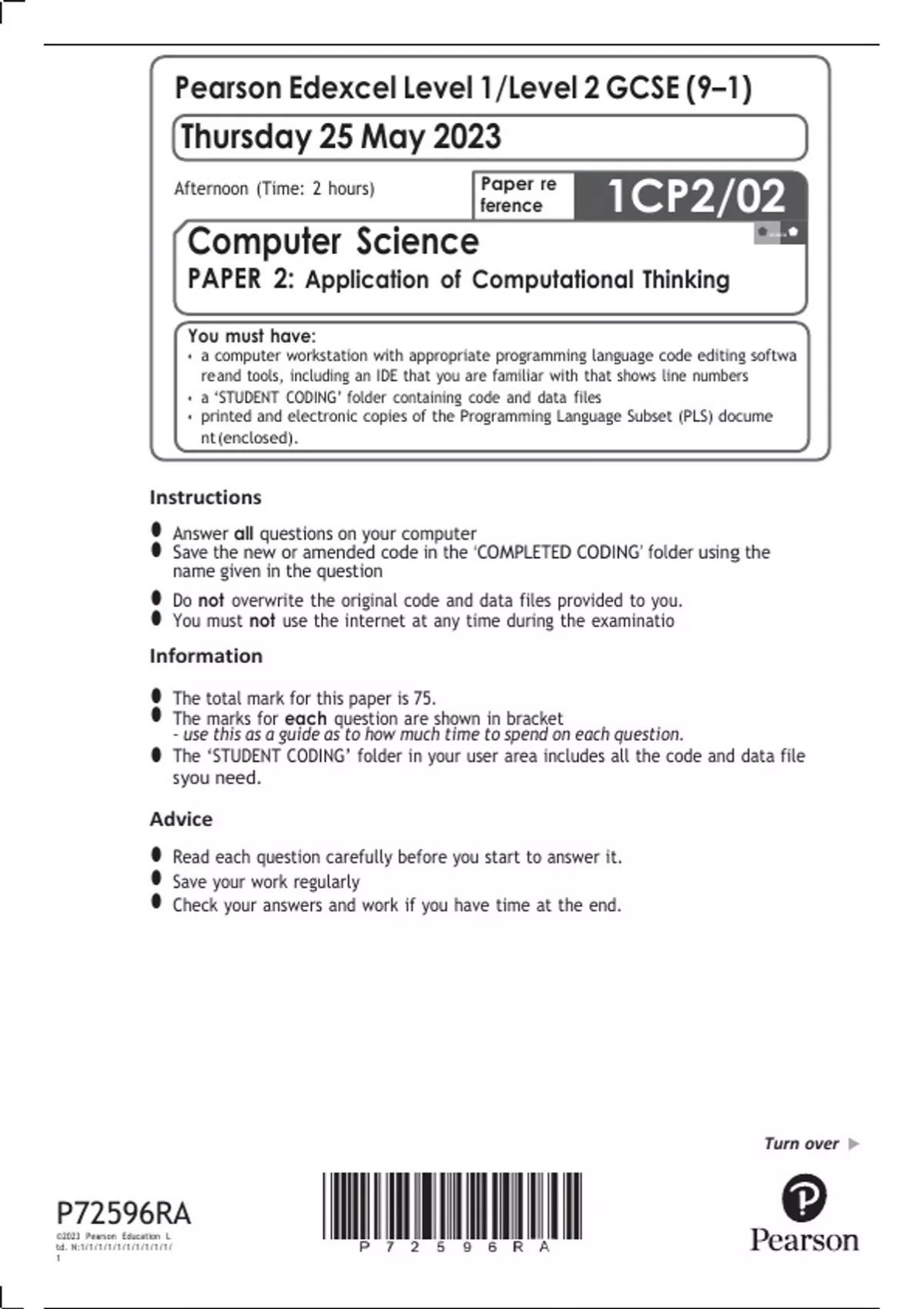 Pearson Edexcel Level 1Level 2 GCSE (9–1) Computer Science PAPER 2 Application of Computational Th