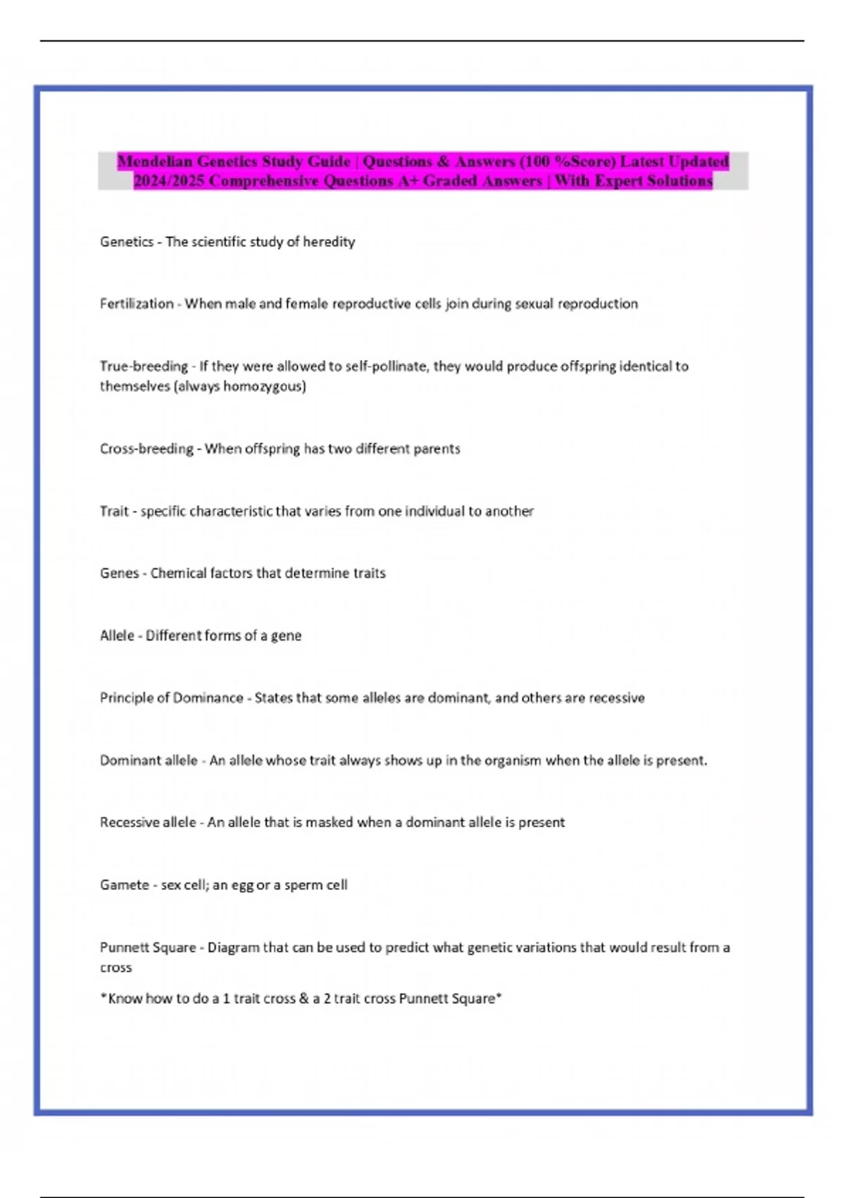 Mendelian Genetics Study Guide | Questions & Answers