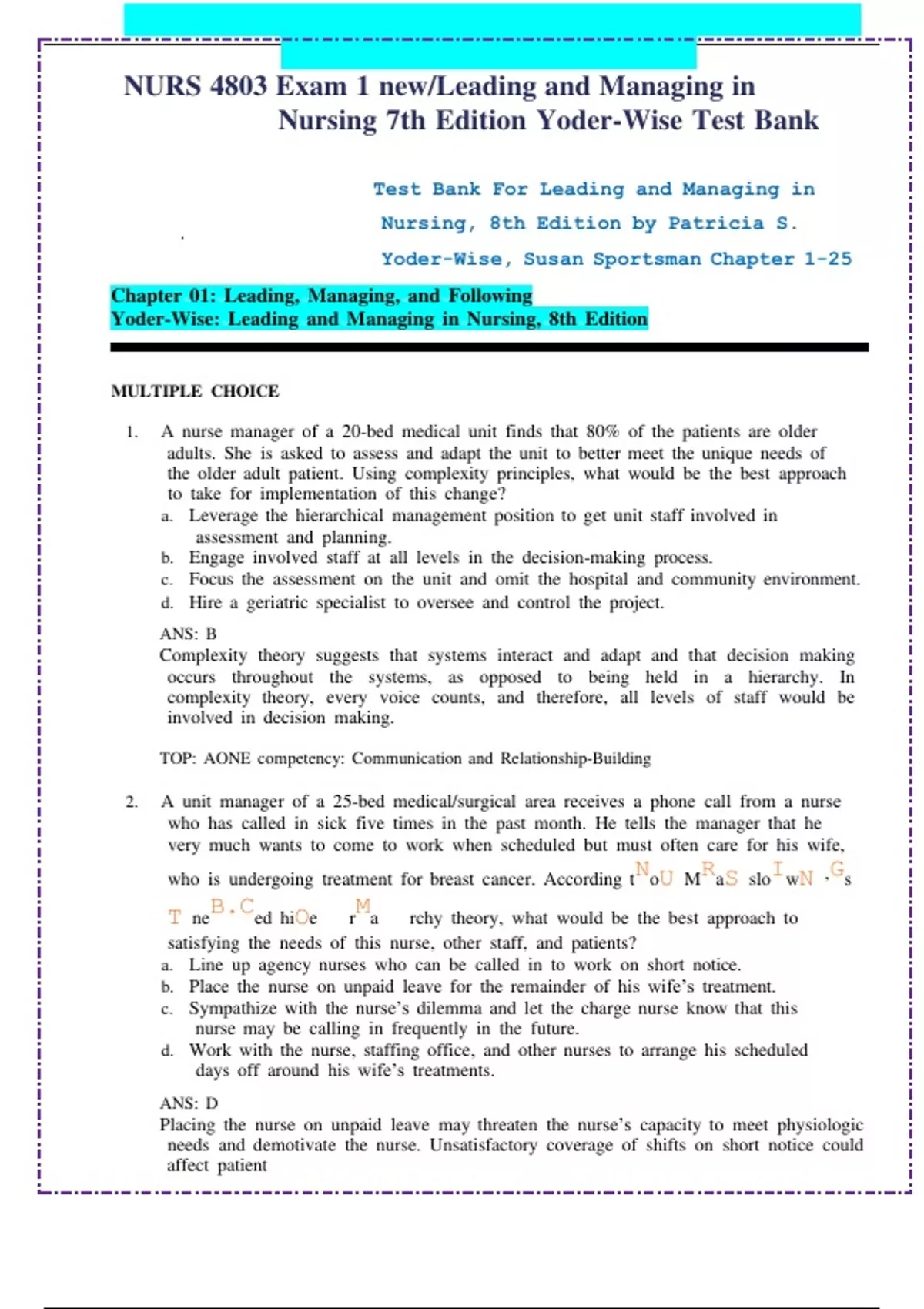 NURS 4803 Exam 1 new/Leading and Managing in Nursing 7th Edition Yoder-Wise Test Bank