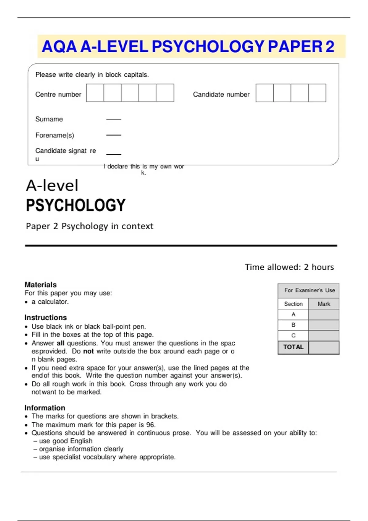 AQA A-LEVEL PSYCHOLOGY PAPER 2