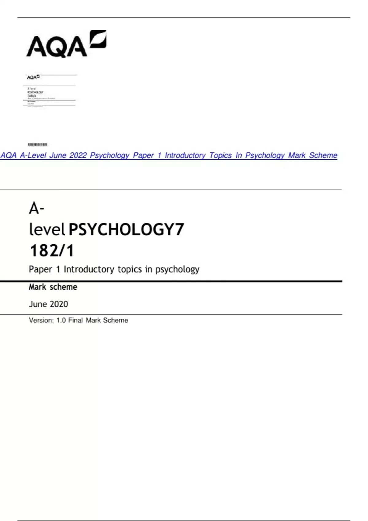 AQAm A-Levelm Junem 2022m Psychologym Paperm 1m Introductorym Topicsm Inm Psychologym Markm Scheme