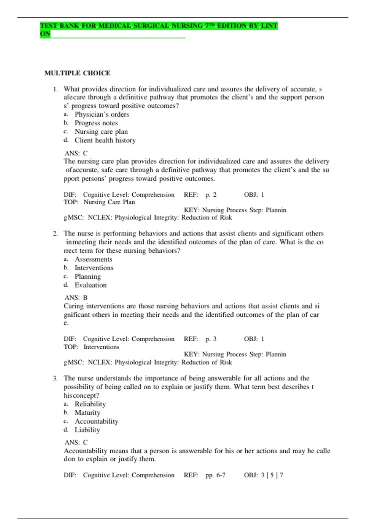 TESTmBANKmFORmMEDICALmSURGICALmNURSINGm7THmEDITIONmBYmLINT