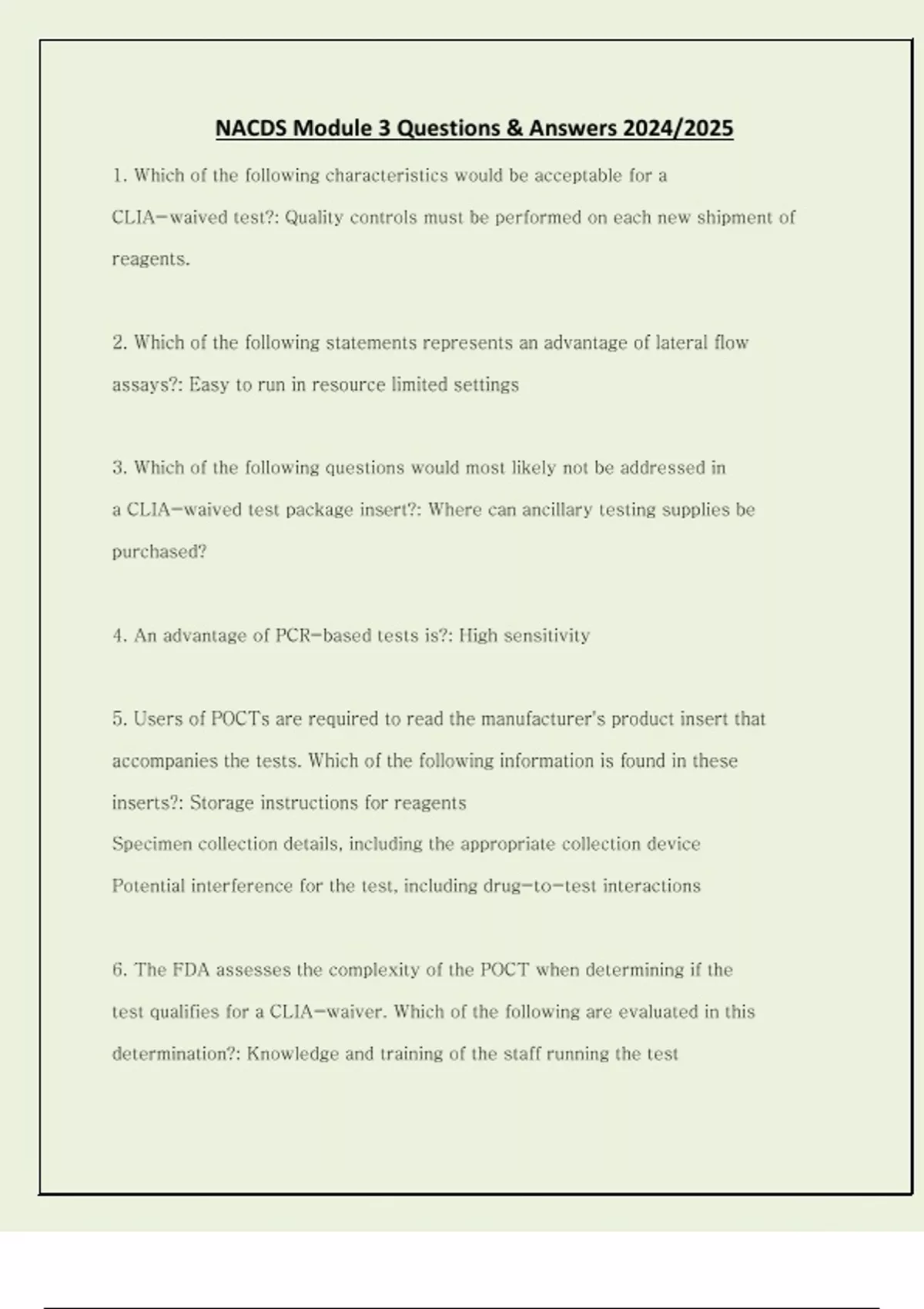 NACDS Module 3 Questions & Answers 2024/2025 1. Which of the following characteristics would be acceptable for a CLIA-waived test?: Quality controls must be performed on each new shipment of reagents. 2. Which of the following statements represents an advantage of lateral flow assays?: Easy to run in resource limited settings 3. Which of the following questions would most likely not be addressed in a CLIA-waived test package insert?: Where can ancillary testing supplies be purchased? 4. An advantage of PCR-based tests is?: