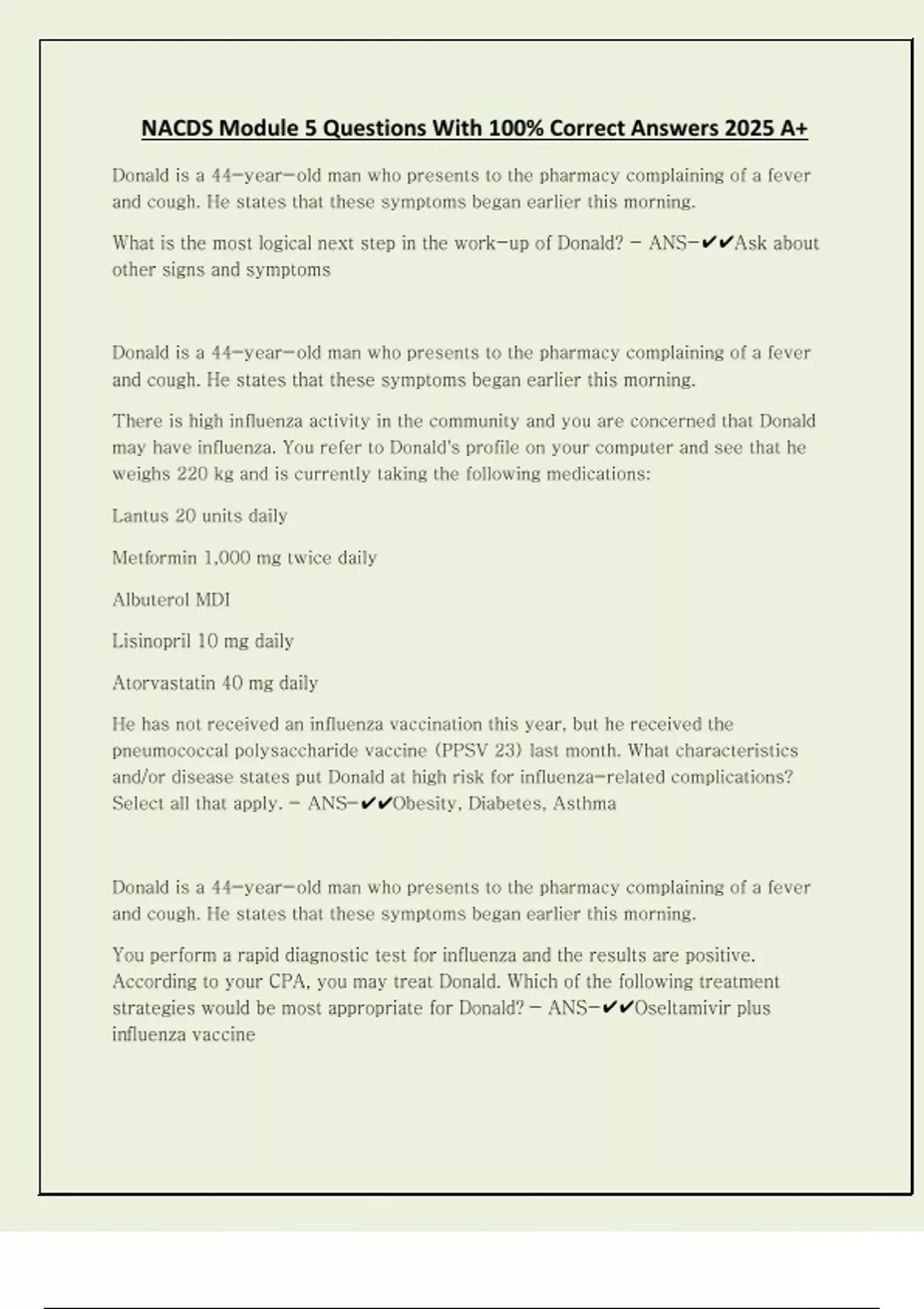 NACDS Module 5 Questions With 100% Correct Answers 2025 A+ Donald is a 44-year-old man who presents to the pharmacy complaining of a fever and cough. He states that these symptoms began earlier this morning. What is the most logical next step in the work-up of Donald? - ANS-Ask about other signs and symptoms Donald is a 44-year-old man who presents to the pharmacy complaining of a fever and cough. He states that these symptoms began earlier this morning. There is high influenza activity in the community and you are concerned that Donald may have influenza. You refer to Donald's profile on your computer and see that he weighs 220 kg and is currently taking the following medications: Lantus 20 units daily Metformin 1,000 mg twice daily Albuterol MDI Lisinopril 10 mg daily Atorvastatin 40 mg daily He has not received an influenza vaccination this year, but he received the pneumococcal polysaccharide vaccine (PPSV 23) last month. What characteristics and/or disease states put Donald at high risk for influenza-related complications? Select all that apply. - ANS-Obesity, Diabetes, Asthma Donald is a 44-year-old man who presents to the pharmacy complaining of a fever and cough. He states that these symptoms began earlier this morning. You perform a rapid diagnostic test for influenza and the results are positive. According to your CPA, you may treat Donald. Which of the following treatment strategies would be most appropriate for Donald? - ANS...