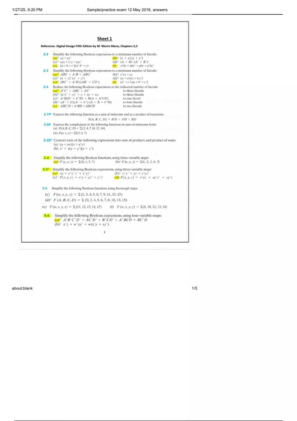 3.7 Simplify the following expressions using k-map in Sum of Products and