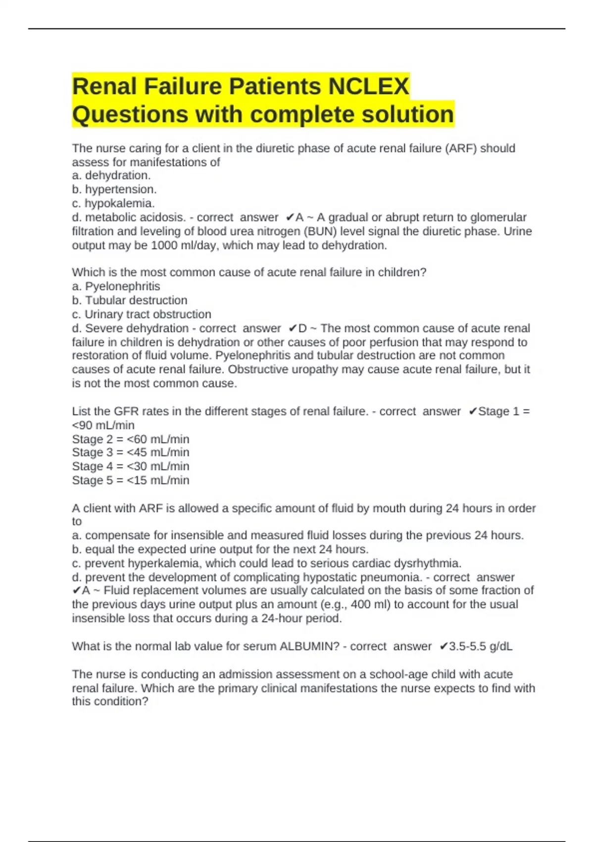 d. a urine specific gravity of 1.001. - correct answer ✔A ~ In oliguric ARF, urine
