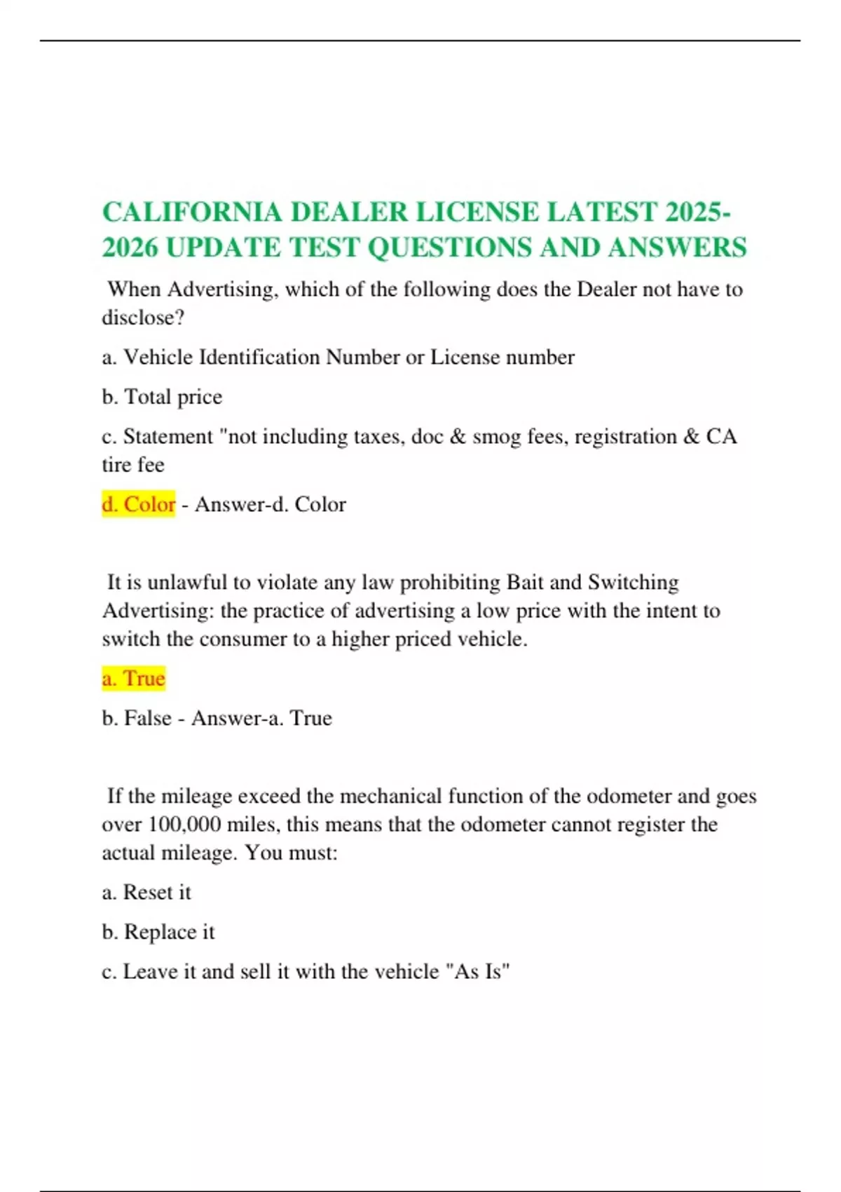 CALIFORNIA DEALER LICENSE LATEST UPDATE TEST QUESTIONS AND ANSWERS
