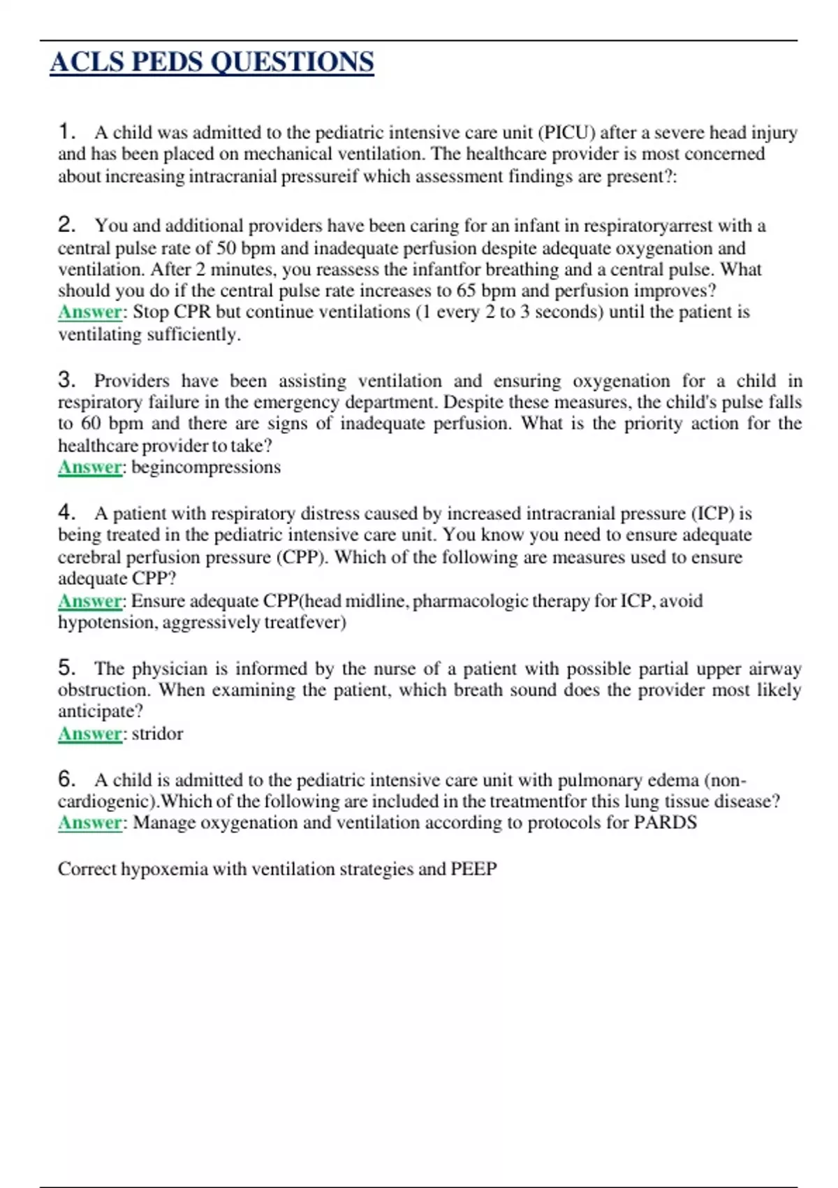 6. A child is admitted to the pediatric intensive care unit with pulmonary edema (non-