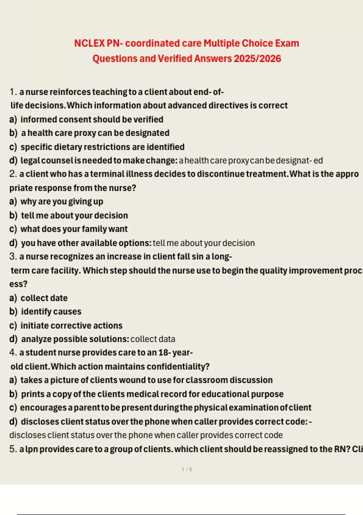 1. a nurse reinforces teaching to a client about end- of-