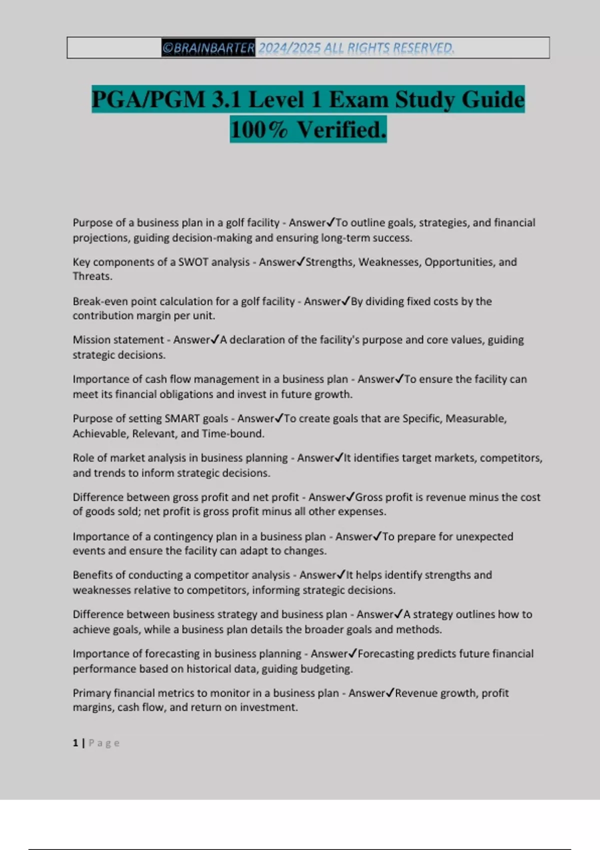 PGA/PGM 3.1 Level 1 Exam Study Guide 100% Verified. Purpose of a business plan in a golf facility - AnswerTo outline goals, strategies, and financial projections, guiding decision-making and ensuring long-term success. Key components of a SWOT analysis - AnswerStrengths, Weaknesses, Opportunities, and Threats. Break-even point calculation for a golf facility - AnswerBy dividing fixed costs by the contribution margin per unit. Mission statement - AnswerA declaration of the facility's purpose and core values, guiding strategic decisions. Importance of cash flow management in a business plan - AnswerTo ensure the facility can meet its financial obligations and invest in future growth. Purpose of setting SMART goals - AnswerTo create goals that are Specific, Measurable, Achievable, Relevant, and Time-bound. Role of market analysis in business planning - AnswerIt identifies target markets, competitors, and trends to inform strategic decisions. Difference between gross profit and net profit - AnswerGross profit is revenue minus the cost of goods sold; net profit is gross profit minus all other expenses. Importance of a contingency plan in a business plan - AnswerTo prepare for unexpected events and ensure the facility can adapt to changes. Benefits of conducting a competitor analysis - AnswerIt helps identify strengths and weaknesses relative to competitors, informing strategic decisions. Difference between business strategy and business plan - AnswerA strategy outlines how to achieve goals, while a business plan details the broader goals and methods. Importance of forecasting in business planning - AnswerForecasting predicts future financial performance based on historical data, guiding budgeting. Primary financial metrics to monitor in a business plan - AnswerRevenue growth, profit margins, cash flow, and return on investment. ©BRAINBARTER 2024/2025 ALL RIGHTS RESERVED. 2 | P a g e Benchmarking - AnswerComparing a facility's metrics to industry standards to identify areas for improvement. Importance of market segmentation - AnswerIt allows for targeted marketing strategies tailored to specific customer groups. Role of financial projection in a business plan - AnswerTo estimate future revenue, expenses, and profitability, aiding in financial planning. Impact of strategic planning on a golf facility's success - AnswerIt aligns resources with goals, ensuring long-term sustainability and growth. Components of a business plan's executive summary - AnswerOverview of the facility, mission statement, goals, and key financial projections. Integration of technology into a business plan - AnswerThrough digital marketing, online booking systems, and data analytics for decision-making. Importance of stakeholder analysis in business planning - AnswerIt identifies key stakeholders, their interests, and how to engage them effectively. Purpose of a customer service policy in a golf facility - AnswerTo establish consistent service standards that ensure a positive experience for all customers. Creating a welcoming environment for new customers - AnswerBy providing clear information, friendly staff interactions, and an inviting atmosphere. Four steps of effective customer service - AnswerGreeting, Understanding Needs, Delivering Service, and Following Up. Contribution of effective communication to customer satisfaction - AnswerIt ensures customers feel heard and understood, leading to better service and stronger relationships. Importance of follow-up in customer service - AnswerIt shows that the facility values customer feedback and is committed to continuous improvement. Techniques for resolving customer conflicts - AnswerActive listening, staying calm, finding common ground, and offering solutions. Impact of personalization on customer experience - AnswerBy tailoring services to individual preferences, enhancing overall satisfaction and loyalty. Impact of first impressions on customer relations - AnswerFirst impressions set the tone for the entire customer experience and influence customer retention. Enhancement of customer service through technology - AnswerThrough online booking, mobile apps, and CRM sys