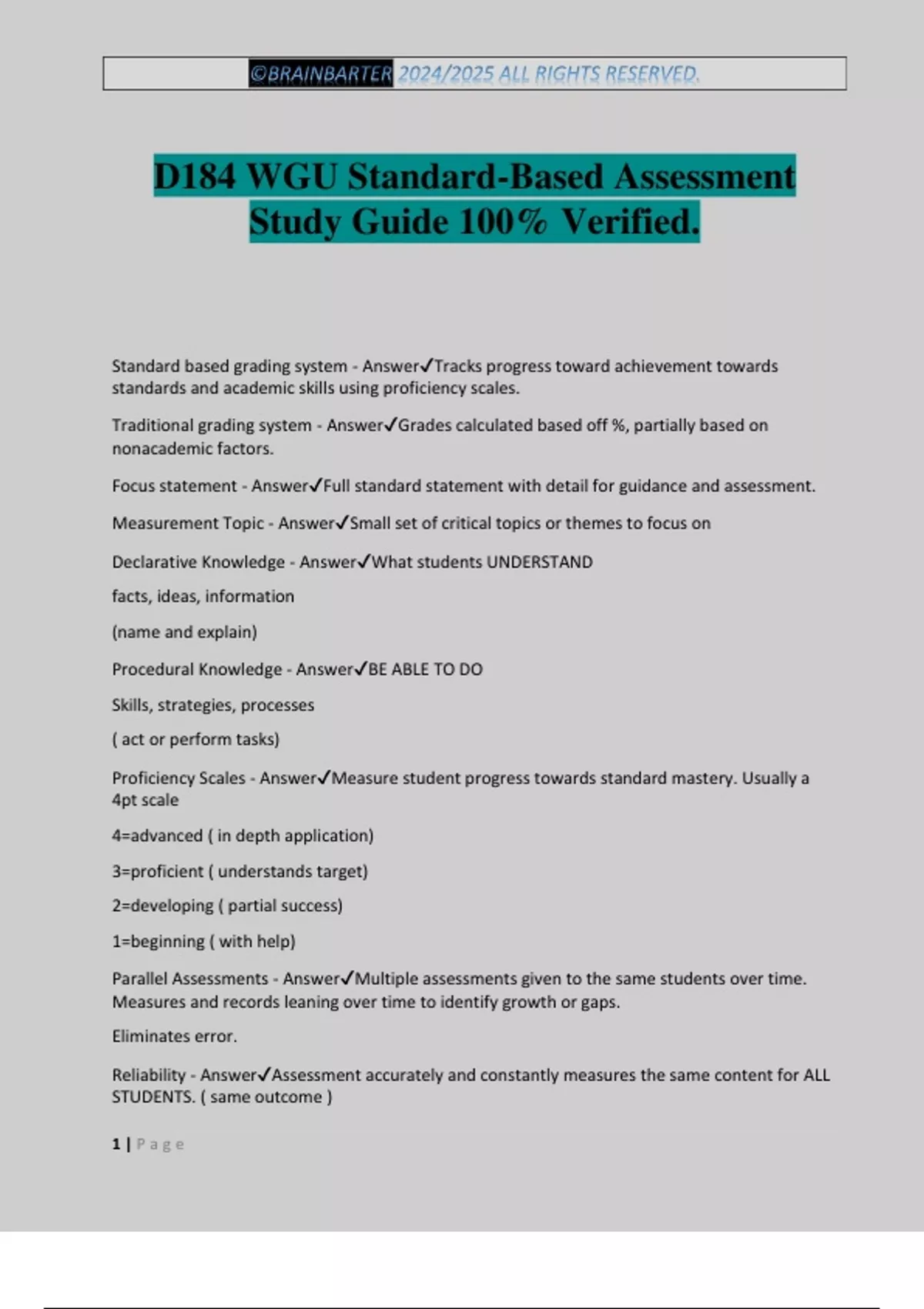 D184 WGU Standard-Based Assessment Study Guide 100% Verified. Standard based grading system - AnswerTracks progress toward achievement towards standards and academic skills using proficiency scales. Traditional grading system - AnswerGrades calculated based off %, partially based on nonacademic factors. Focus statement - AnswerFull standard statement with detail for guidance and assessment. Measurement Topic - AnswerSmall set of critical topics or themes to focus on Declarative Knowledge - AnswerWhat students UNDERSTAND facts, ideas, information (name and explain) Procedural Knowledge - AnswerBE ABLE TO DO Skills, strategies, processes ( act or perform tasks) Proficiency Scales - AnswerMeasure student progress towards standard mastery. Usually a 4pt scale 4=advanced ( in depth application) 3=proficient ( understands target) 2=developing ( partial success) 1=beginning ( with help) Parallel Assessments - AnswerMultiple assessments given to the same students over time. Measures and records leaning over time to identify growth or gaps. Eliminates error. Reliability - AnswerAssessment accurately and constantly measures the same content for ALL STUDENTS. ( same