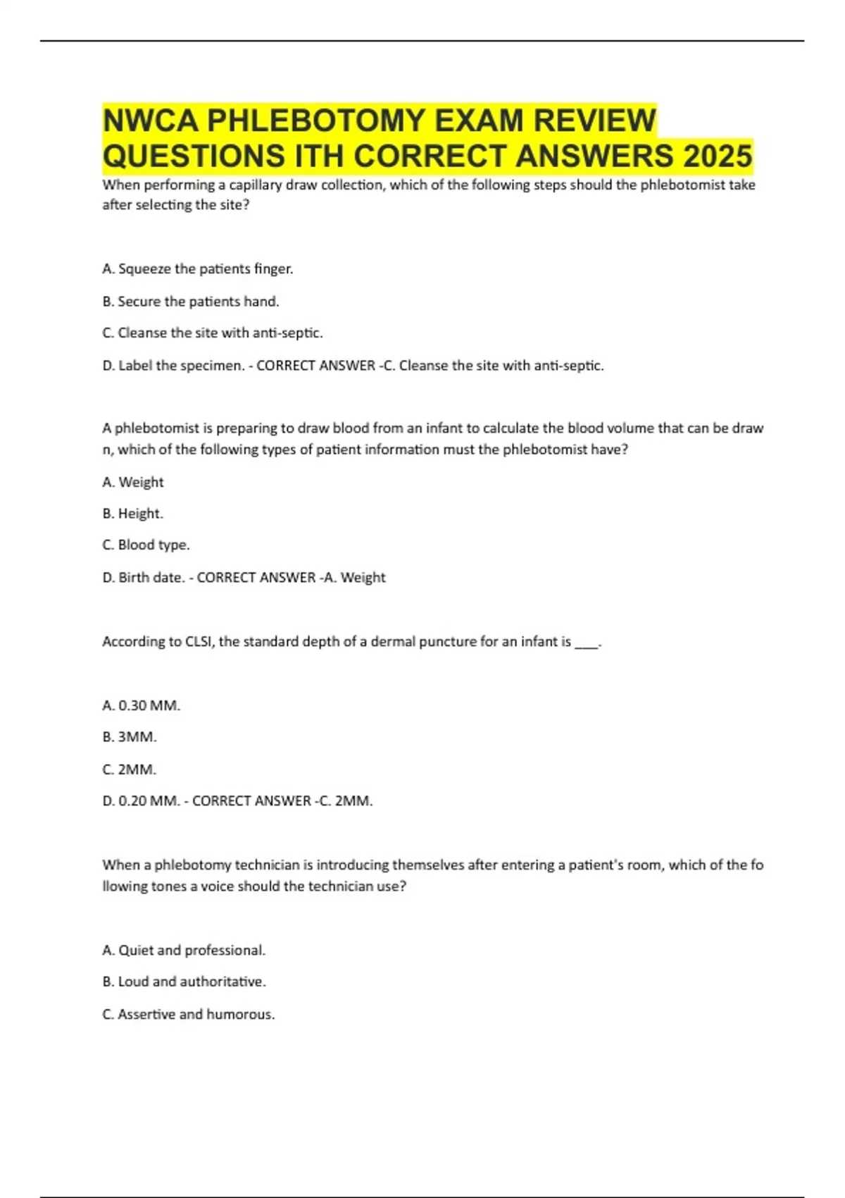 NWCA PHLEBOTOMY EXAM REVIEW QUESTIONS ITH CORRECT ANSWERS 2025