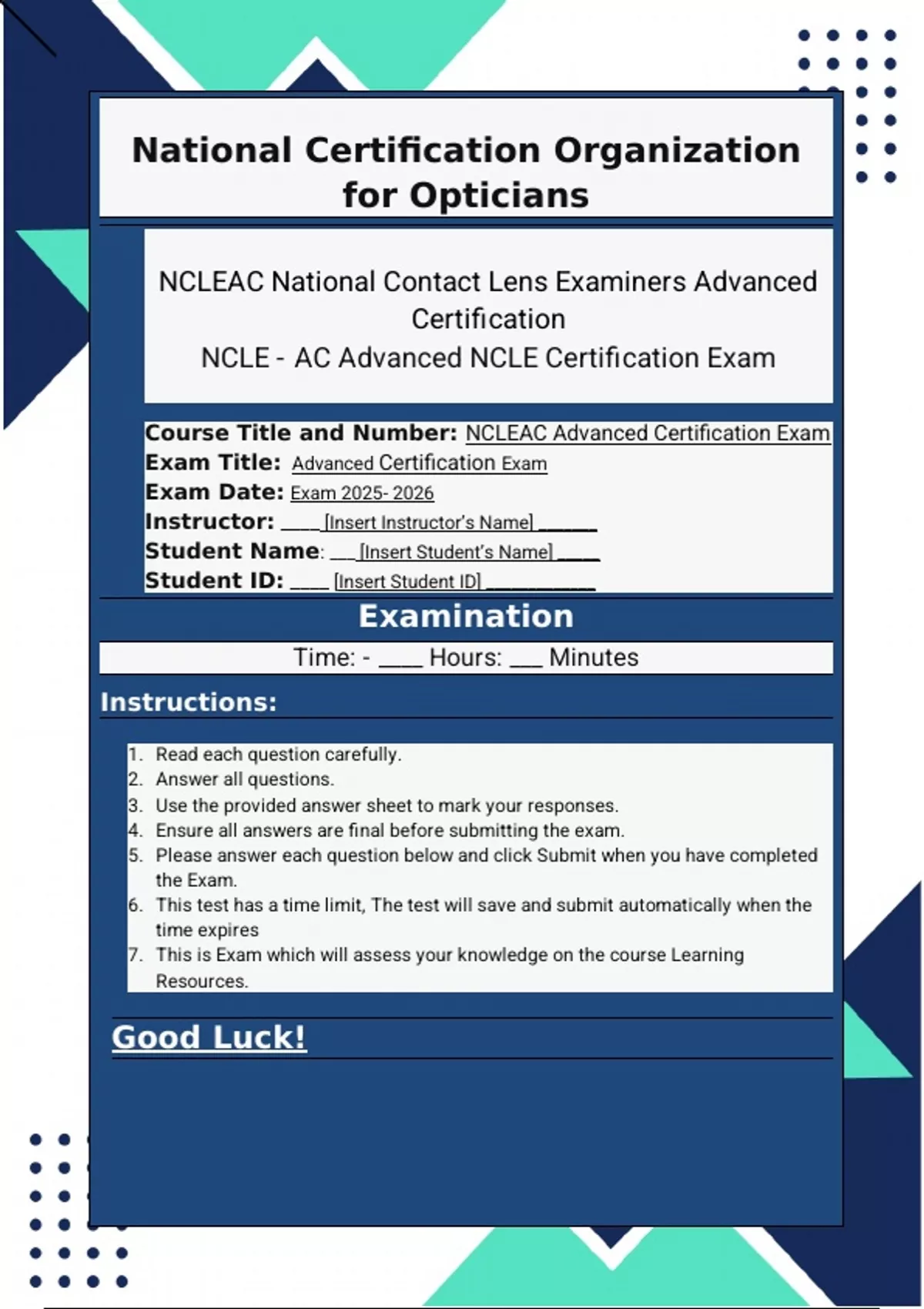 NCLE- AC National Contact Lens Examiners Advanced