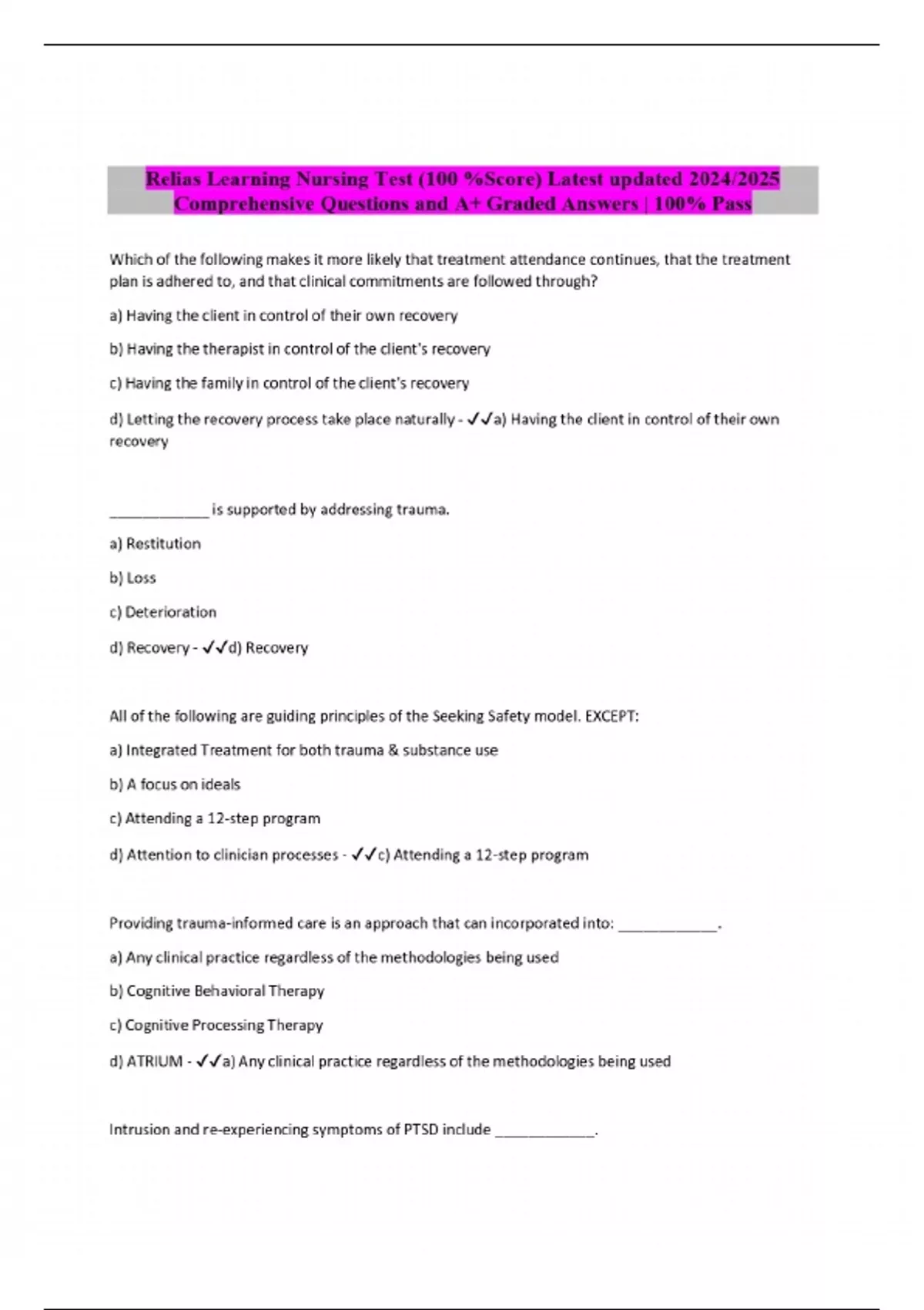 Relias Learning Nursing Test (100 %Score) Latest updated 2024/2025 Comprehensive Questions and Answers