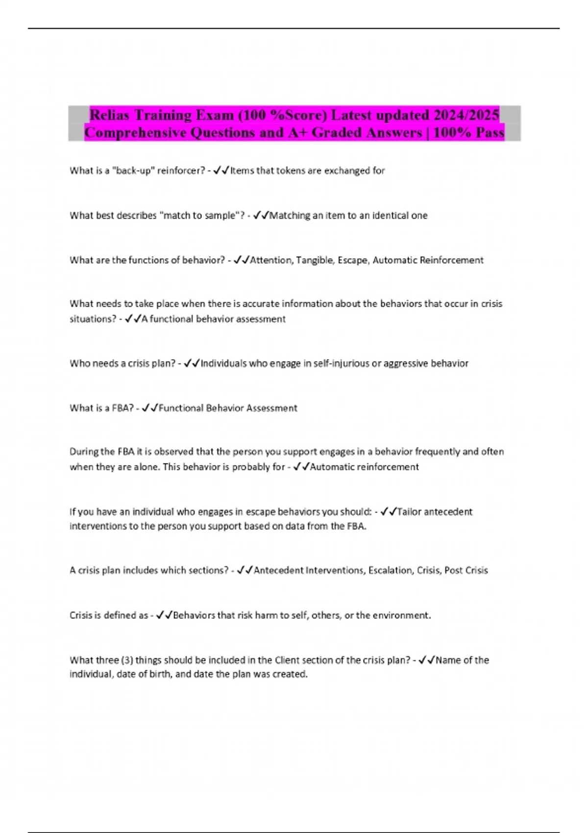 Relias Training Exam (100 %Score) Latest updated 2024/2025 Comprehensive Questions and Answers