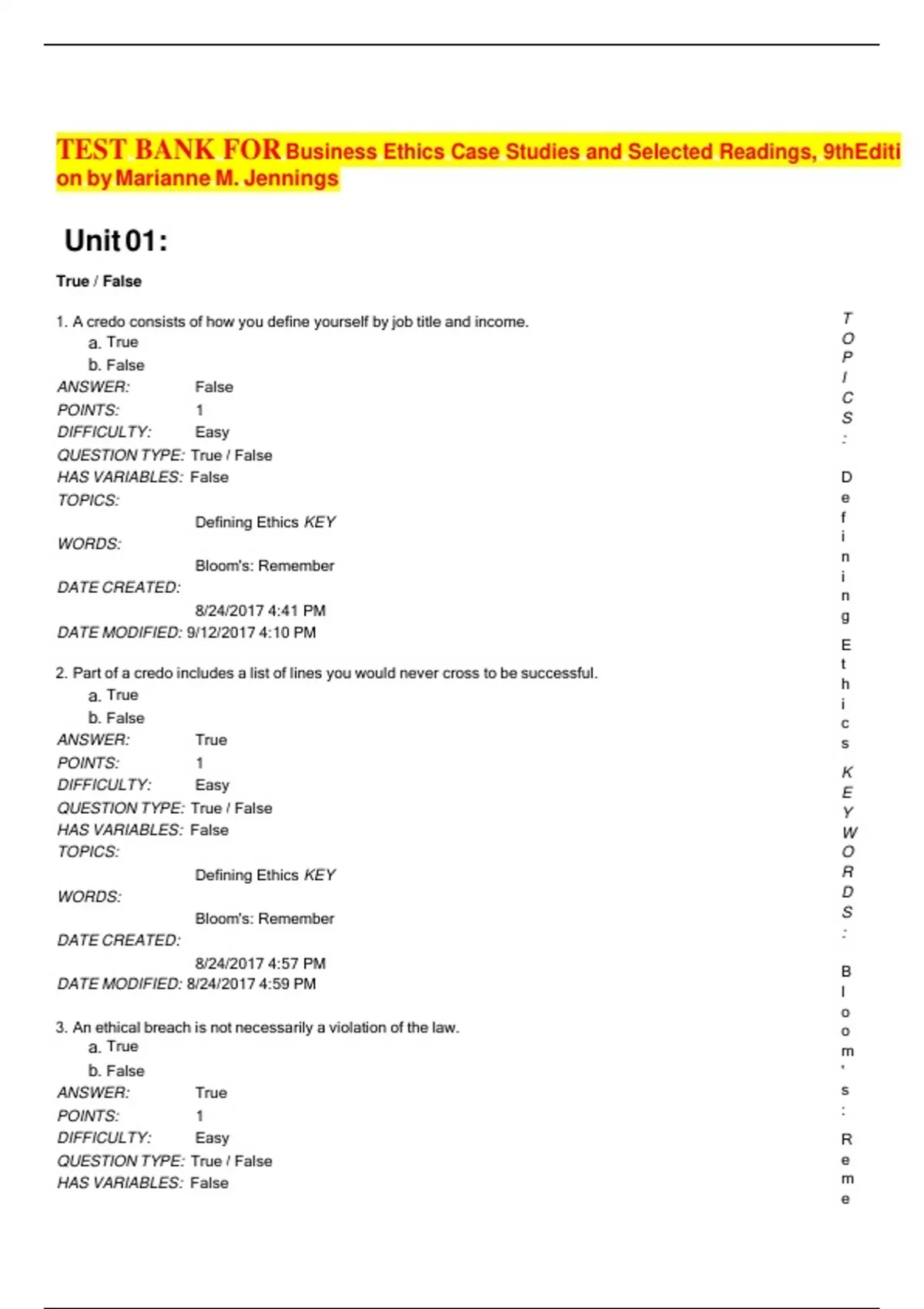 TEST BANK FOR Business Ethics Case Studies and Selected Readings, 9thEditi