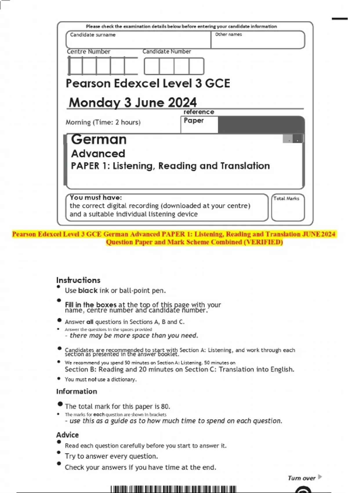 Pearson Edexcel Level 3 GCE German Advanced PAPER 1: Listening, Reading and Translation JUNE 2024 Question Paper and Mark Scheme Combined (VERIFIED)