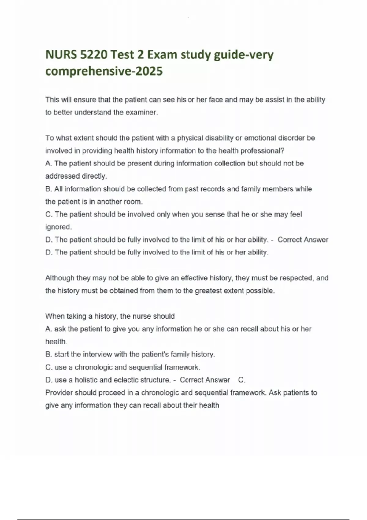 NURS 5220 Test 2 Exam study guide-very comprehensive-2025 This will ensure that the patient can see his or her face and may be assist in the ability to better understand the examiner. To what extent should the patient with a physical disability or emotional disorder be involved in providing health history information to the health professional? A. The patient should be present during information collection but should not be addressed directly. B. All information should be collected from past records and family members while the patient is in another room. C. The patient should be involved only when you sense that he or she may feel ignored. D. The patient should be fully involved to the limit of his or her ability. - Correct Answer D. The patient should be fully involved to the limit of his or her ability. Although they may not be able to give an effective history, they must be respected, and the history must be obtained from them to the greatest extent possible. When taking a history, the nurse should A. ask the patient to give you any information he or she can recall about his or her health. B. start the interview with the patient's family history. C. use a chronologic and sequential framework. D. use a holistic and eclectic structure. - Correct Answer C. Provider should proceed in a chronologic and sequential framework. Ask patients to give any information they can recall about their health When questioning the patient regarding his or her sexual history, which question should be asked initially? A. Do you have any particular sexual likes or dislikes? B. Do you have any worries or concerns regarding your sexual life? C. How often do you have intercourse and with whom? D. Do you have any reason to think you may have been exposed to a sexually transmitted infection? - Correct Answer B. When approaching questioning about a sensitive area, it is recommended that the provider first ask open-ended questions that explore the patient's feelings about the