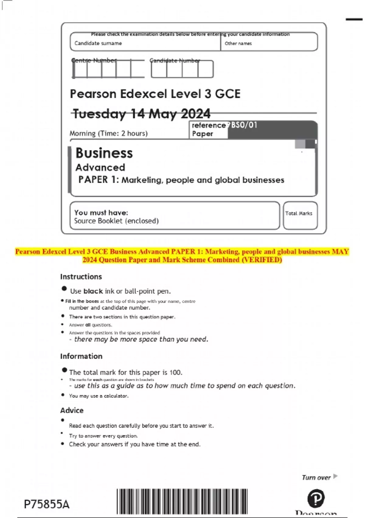 Pearson Edexcel Level 3 GCE Business Advanced PAPER 1: Marketing, people and global businesses MAY 2024 Question Paper and Mark Scheme Combined (VERIFIED)